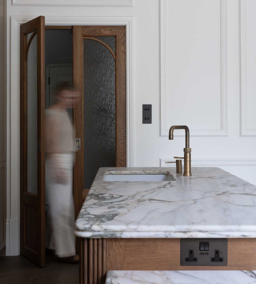‘The island top is made from something called Arabescato Rosa, which is sourced from Italy. I really like the veining and the mix of natural colours. People can be scared of using natural materials, but I think the ageing process adds to the story.