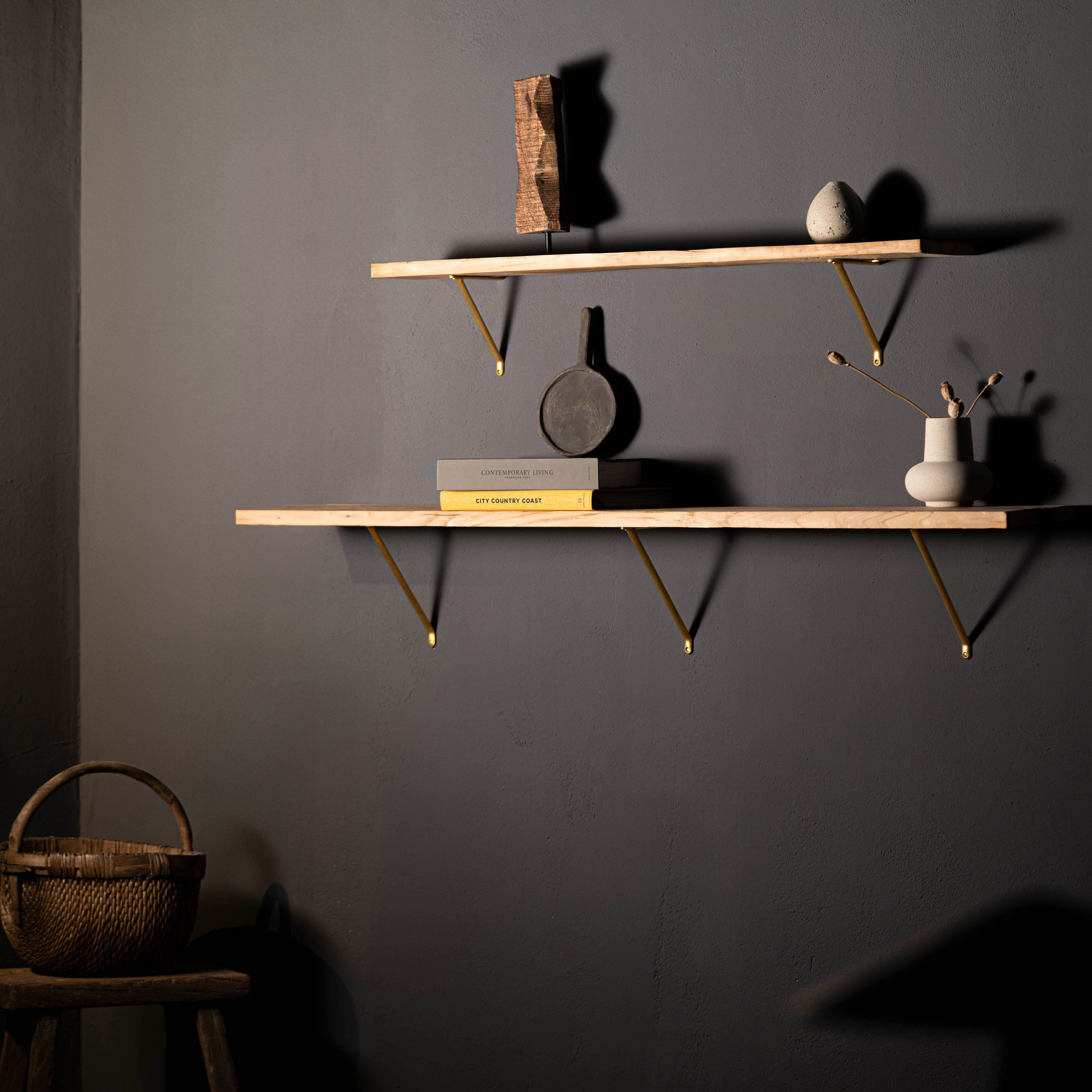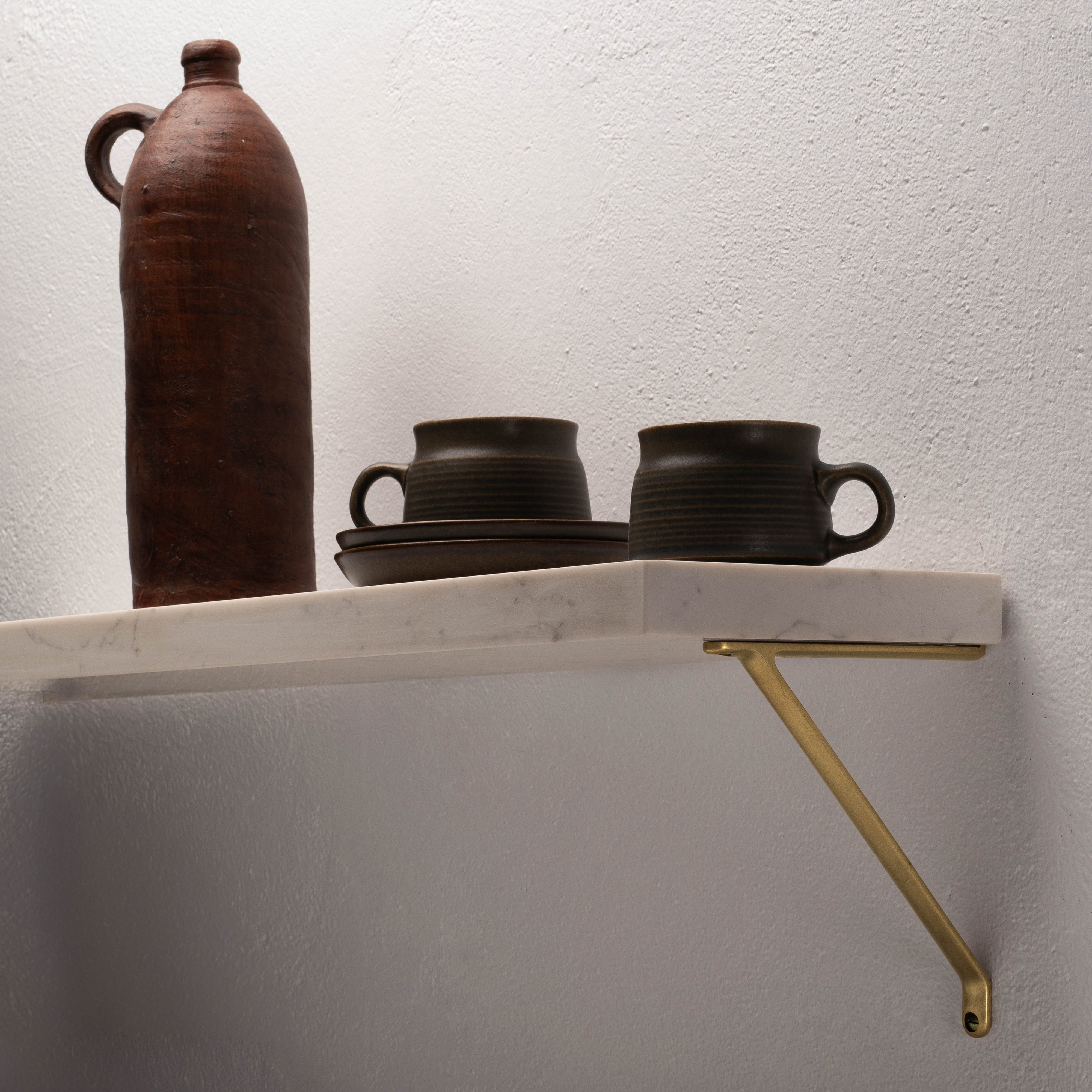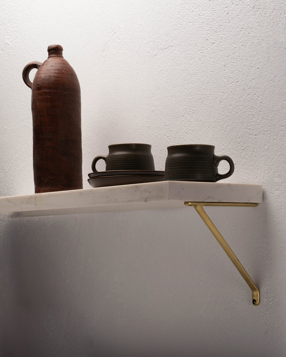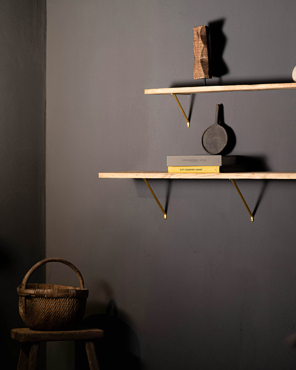 Our Brixton shelf bracket is cast from a single piece of sturdy solid brass. It’ll sit flush against your wall and hold up to 85lbs.