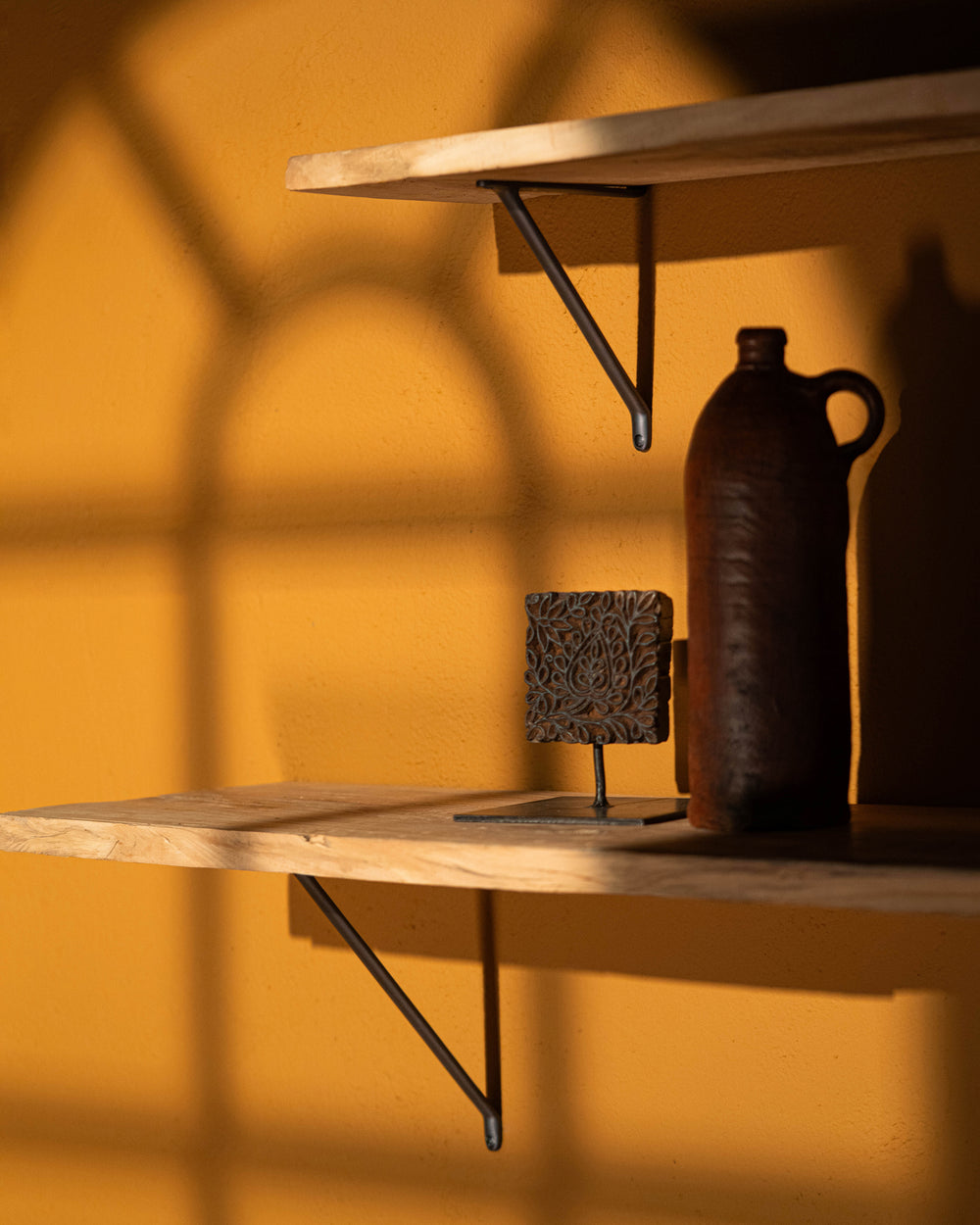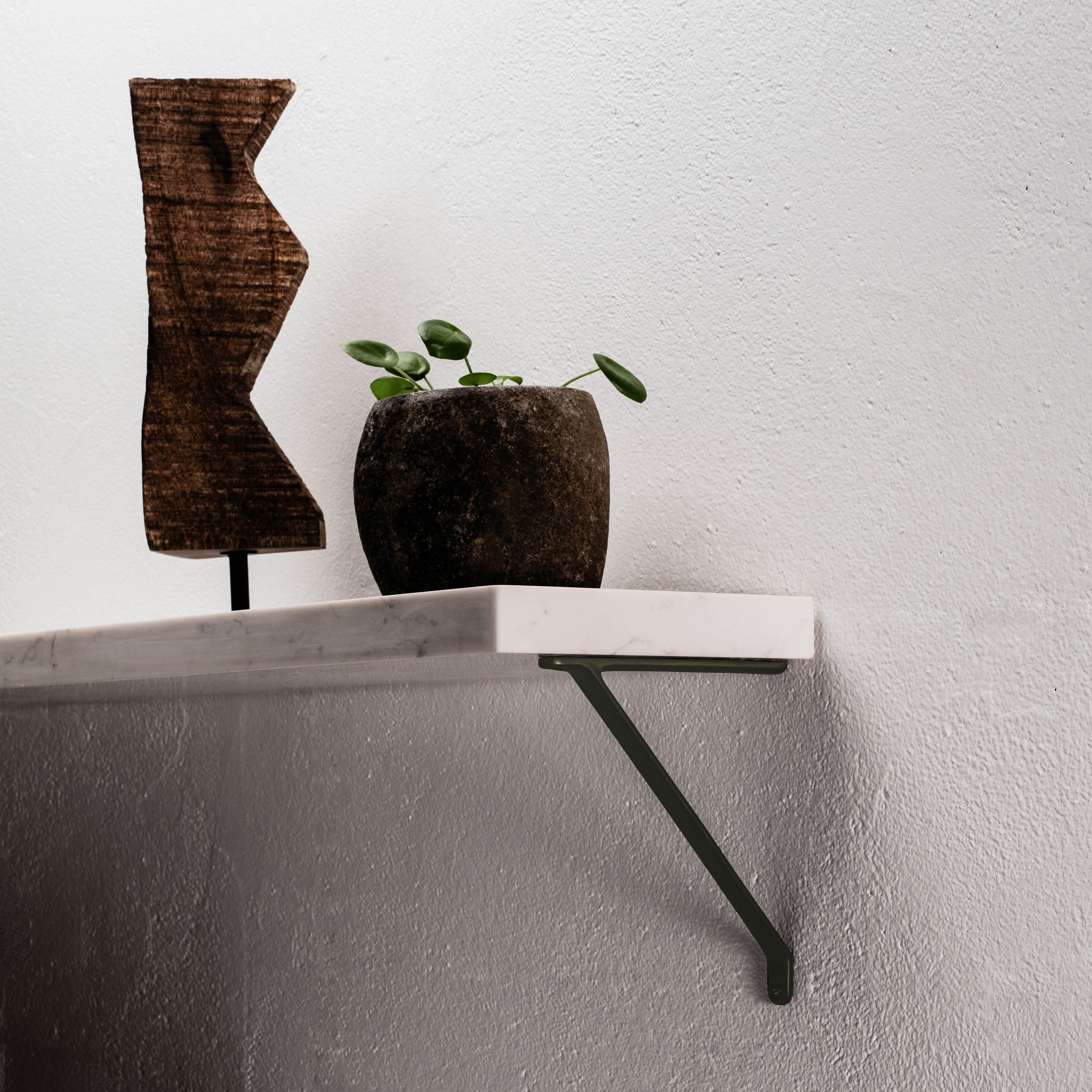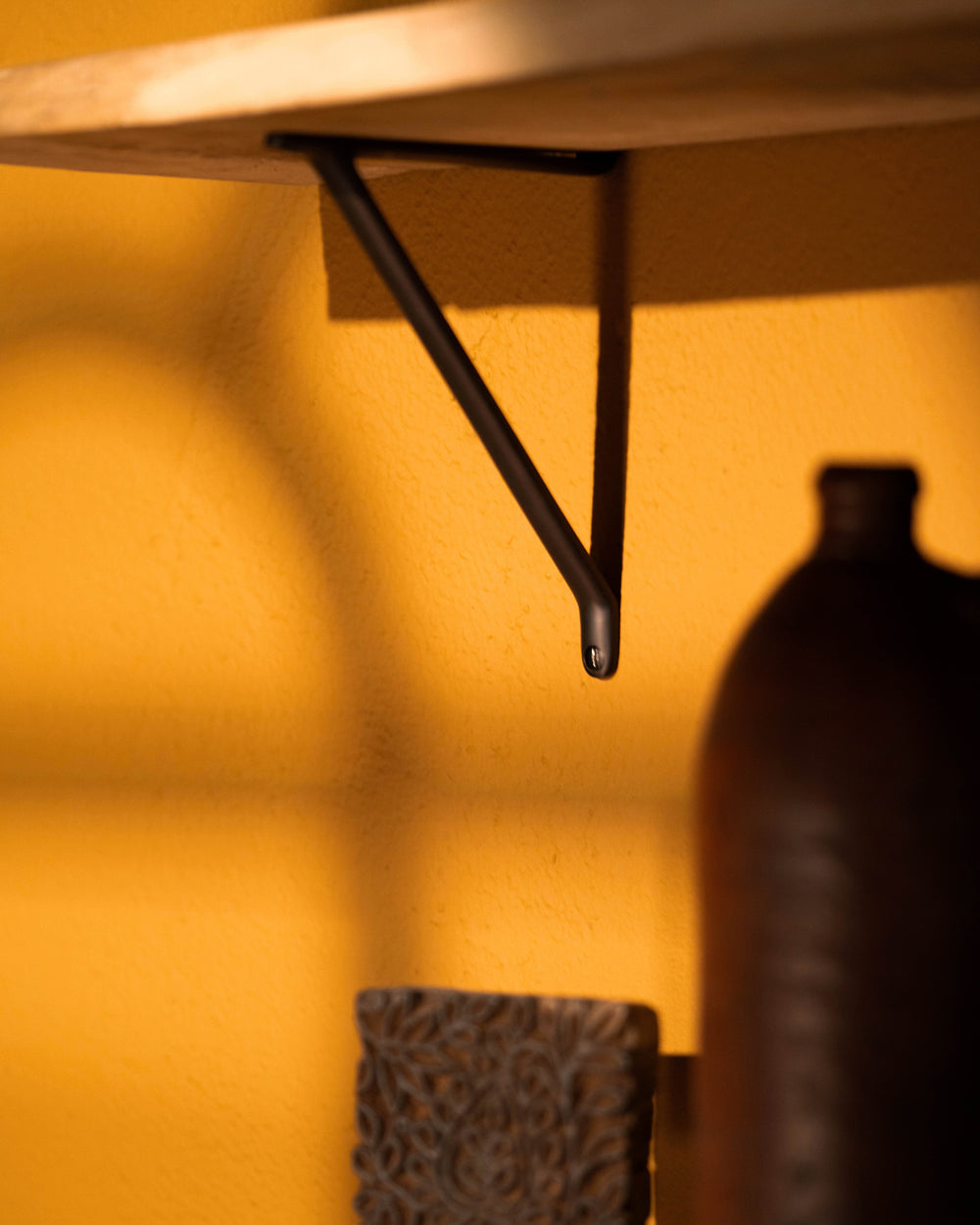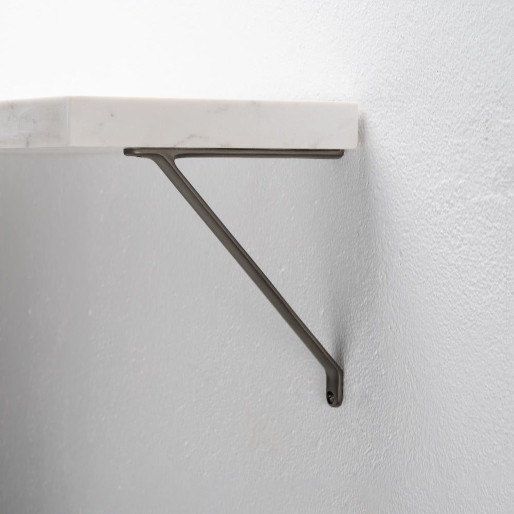 Our Brixton shelf bracket is cast from a single piece of sturdy solid brass. It’ll sit flush against your wall and hold up to 85lbs.