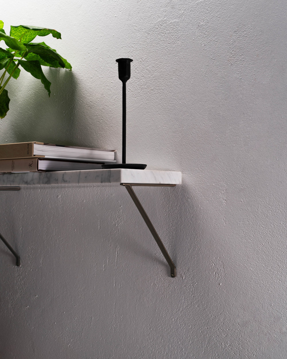 Our Brixton shelf bracket is cast from a single piece of sturdy solid brass. It’ll sit flush against your wall and hold up to 85lbs.