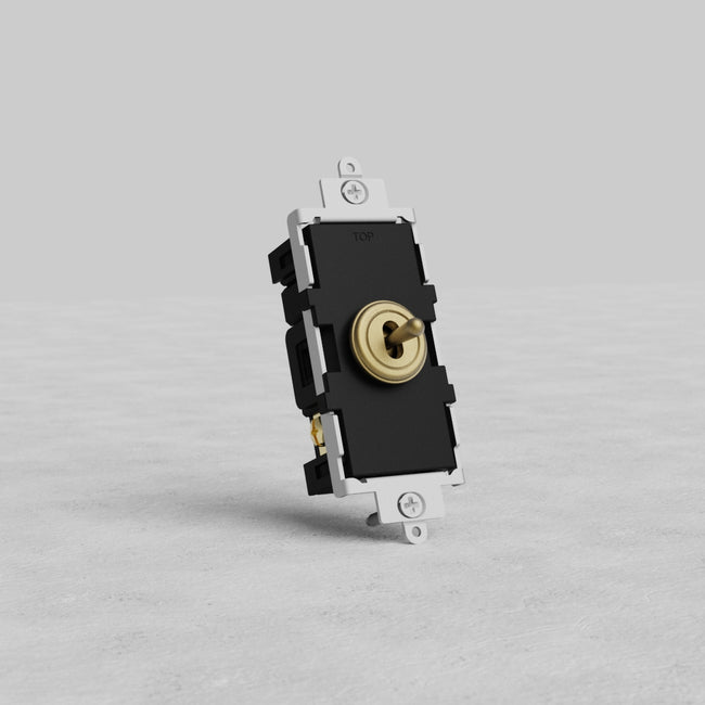 This antique brass center retractive toggle switch works with our Kew and Grove switch plates.