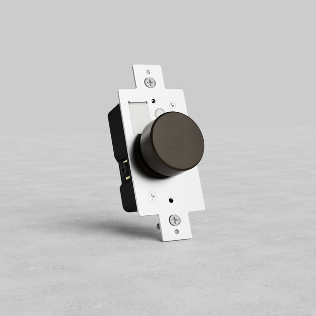 This bronze rotary dimmer switch works with our Kew and Grove switch plates. It has a collar underneath the rotating knob that hides all the working parts.