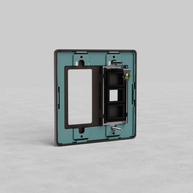 This Grove 2 gang outlet and keystone plate works with any one of our bronze rocker switches or outlet modules and any one of our keystone modules (just make sure you choose the ones made with black plastic).