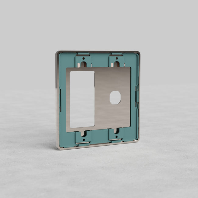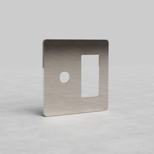 This Grove 2 gang switch and outlet plate works with any one of our polished nickel toggle or rotary dimmer switches and any one of our rocker switches or outlet modules.