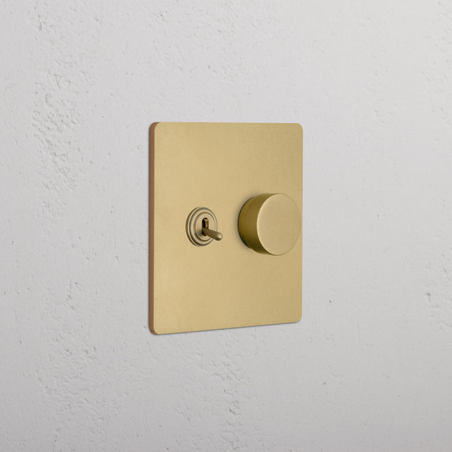This 2 gang mixed switch combines a three-way toggle and a rotary dimmer on one plate.