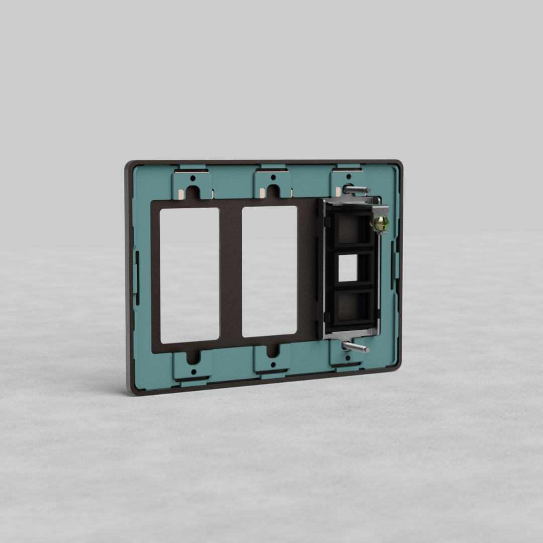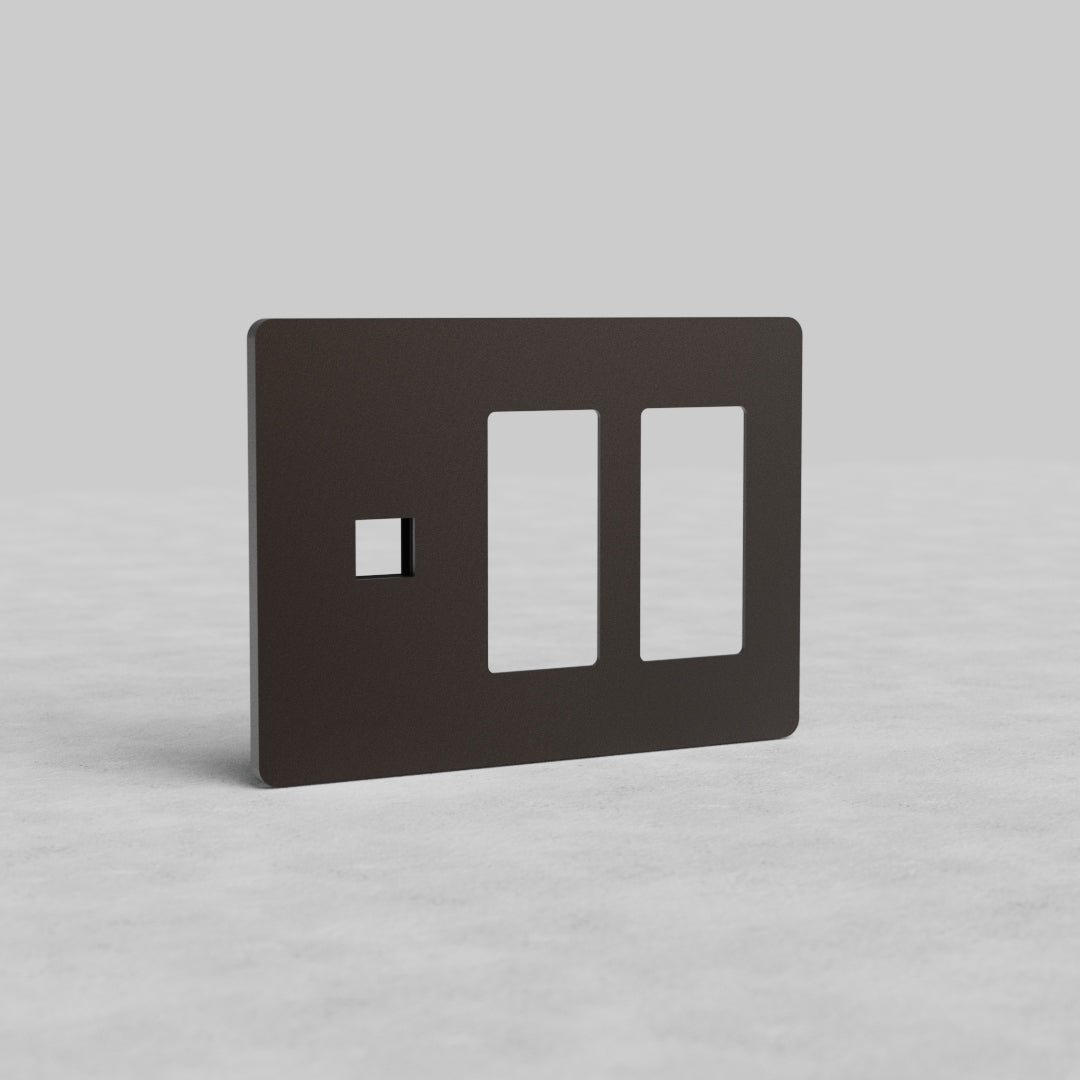 This Grove 3 gang 2x outlet and keystone plate works with any two of our bronze rocker switches or outlet modules and any one of our keystone modules (just make sure you choose the ones made with black plastic).