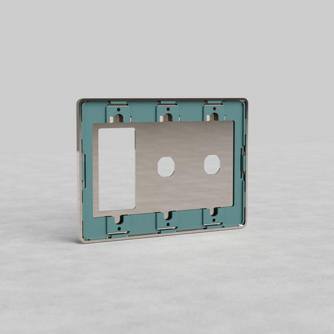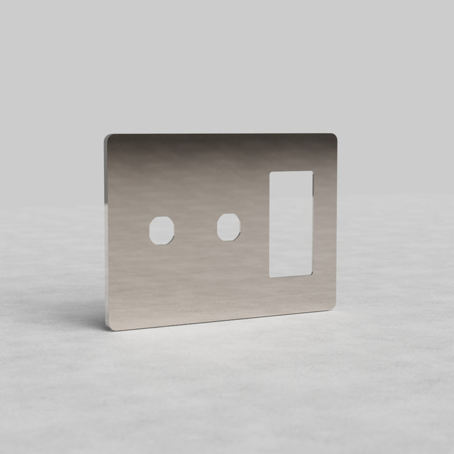 This Grove 3 gang 2x switch and outlet plate works with any two of our polished nickel toggle or rotary dimmer switches and any one of our rocker switches or outlet modules.