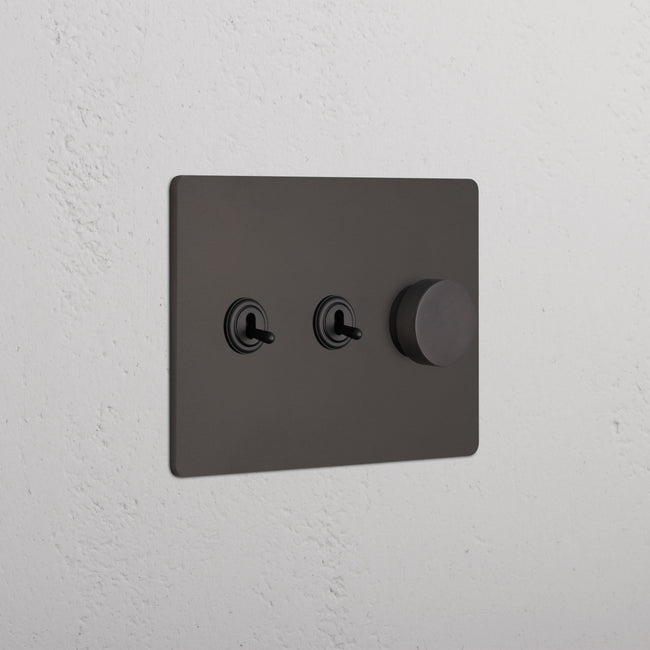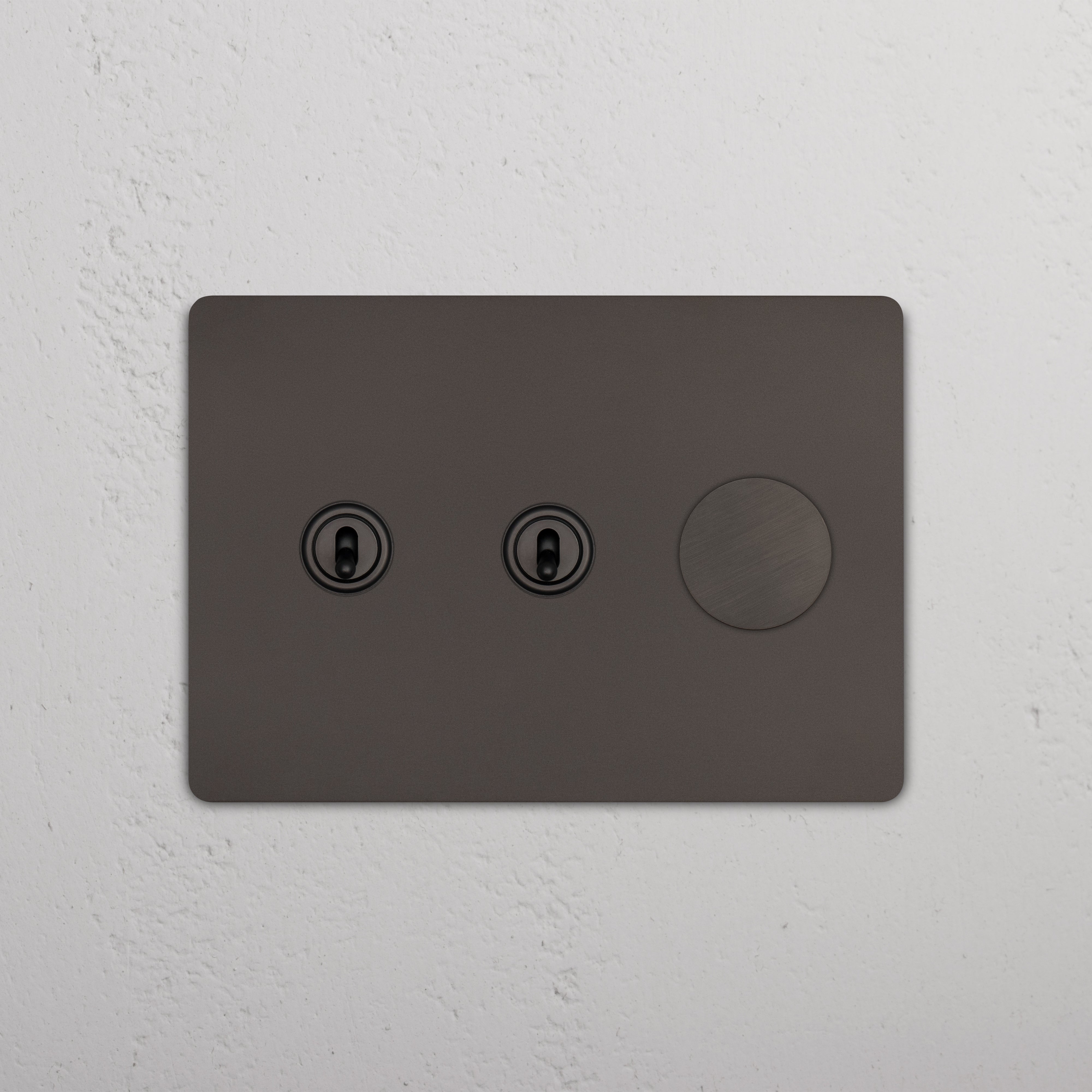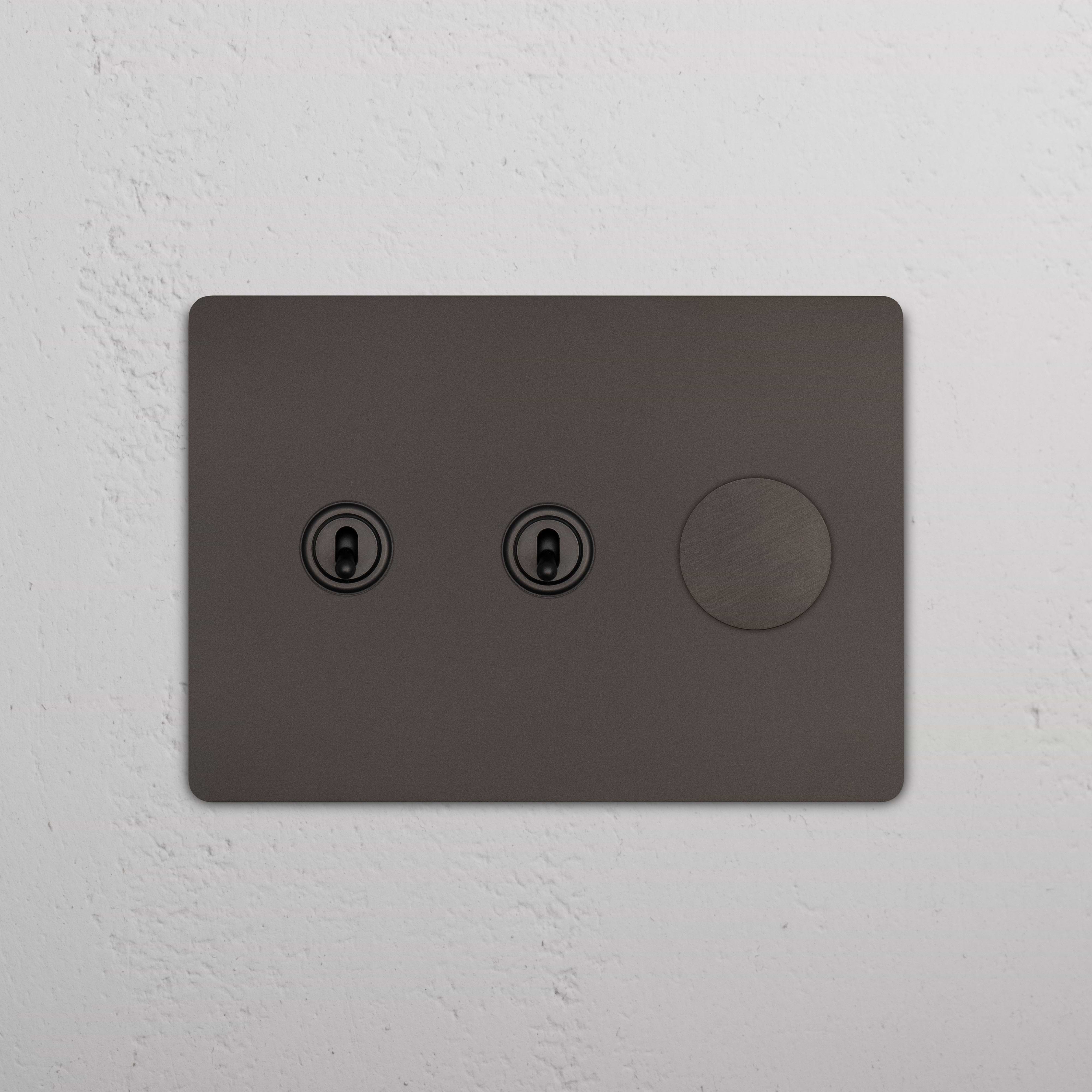 This 3 gang mixed switch combines two three-way toggles and a rotary dimmer on one plate.