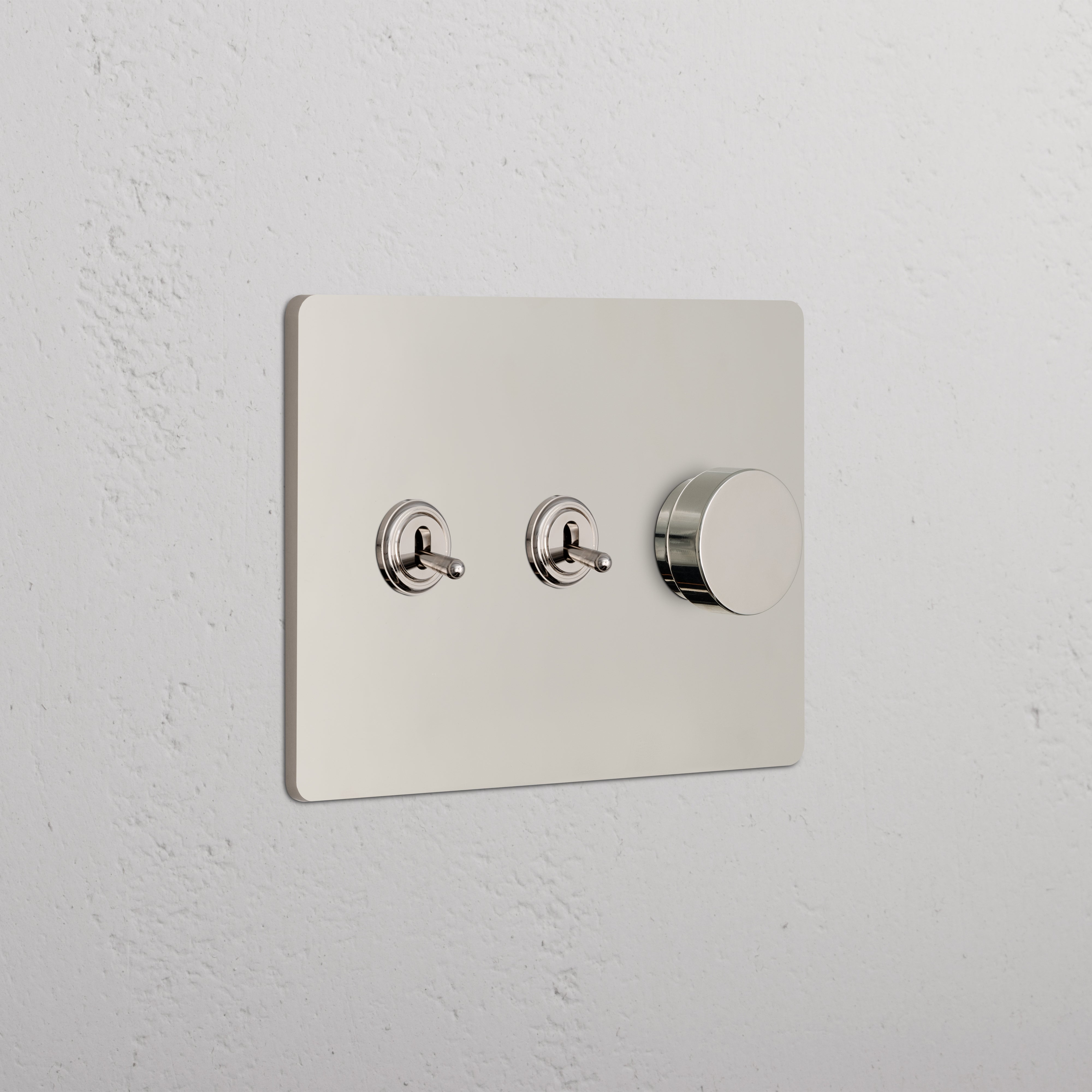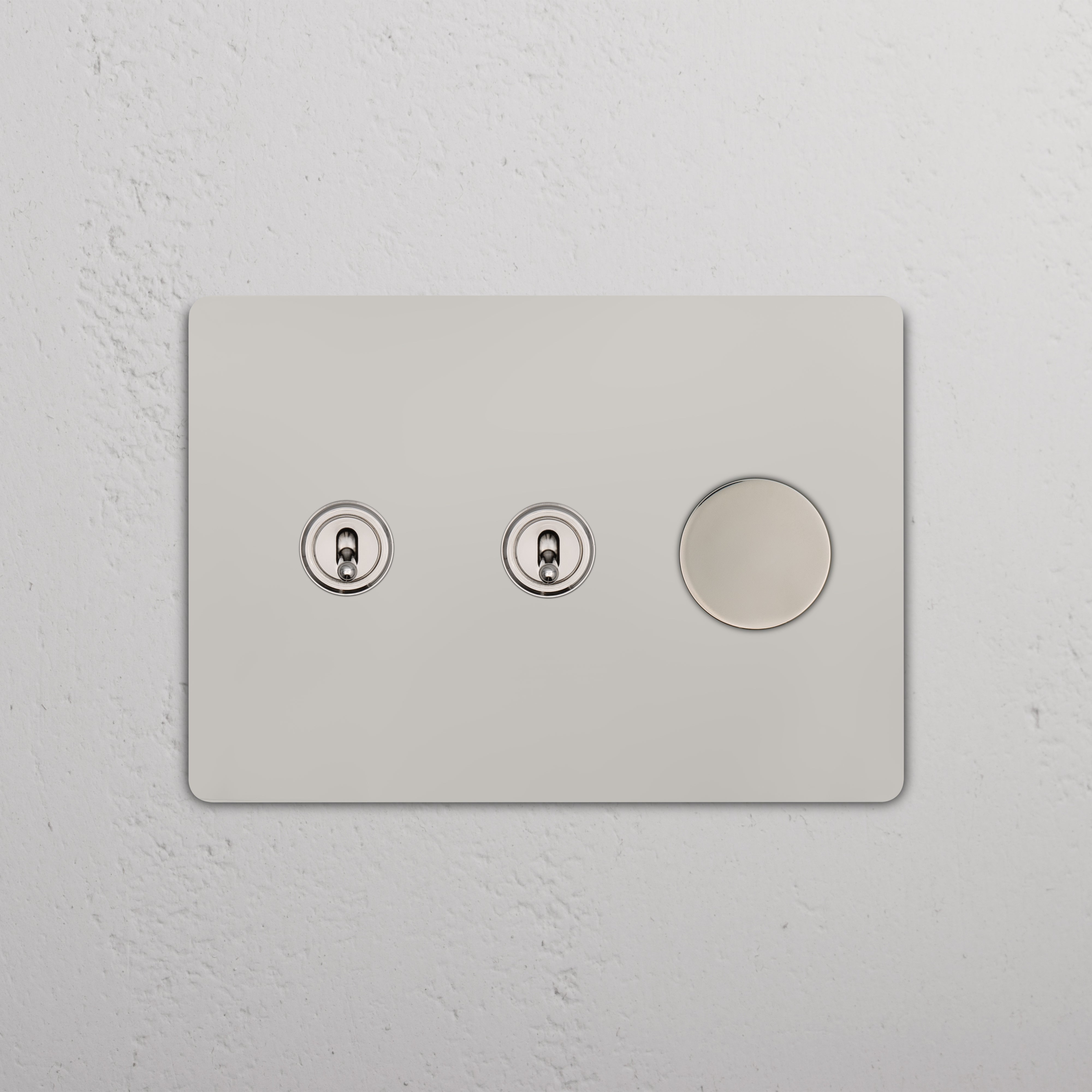 This 3 gang mixed switch combines two three-way toggles and a rotary dimmer on one plate.