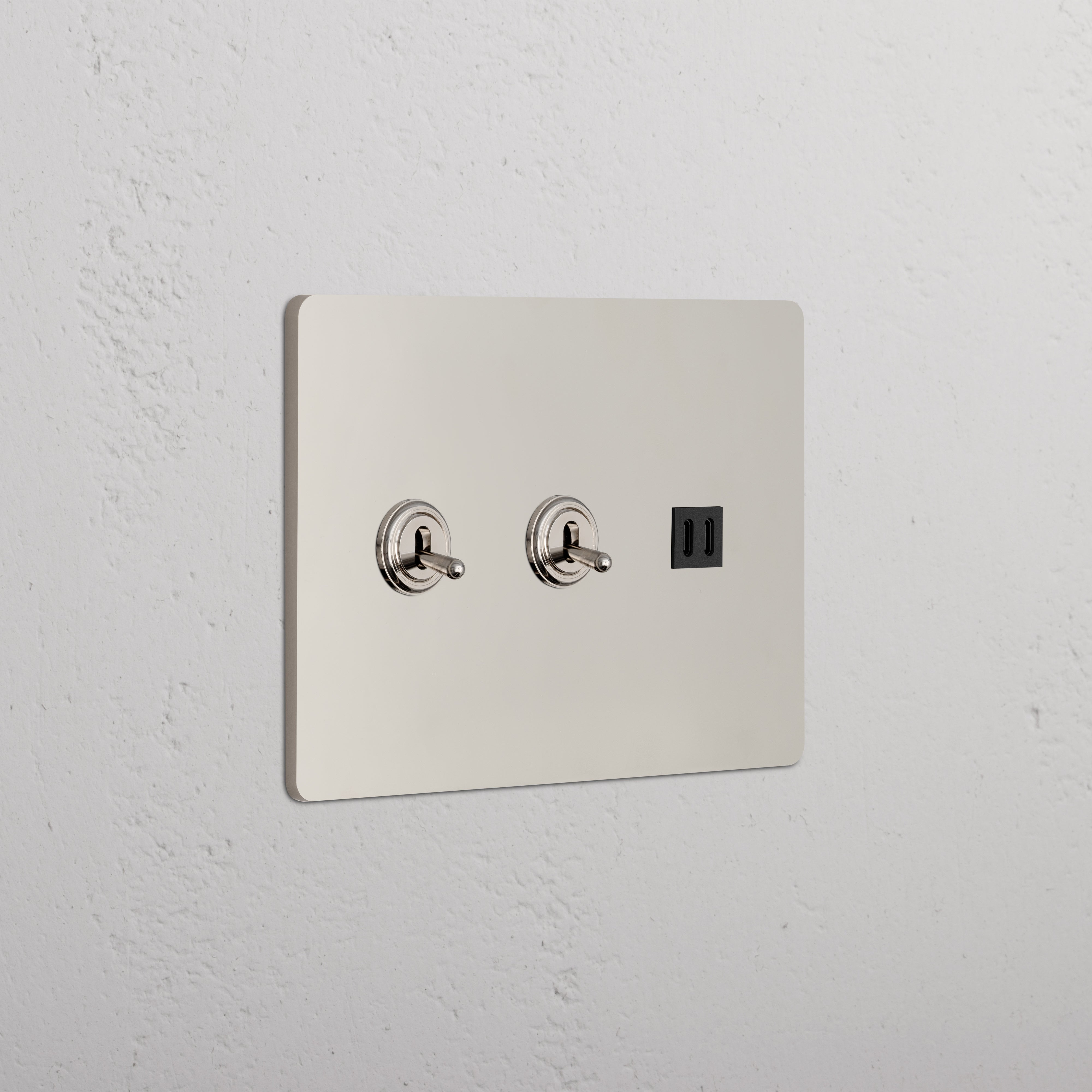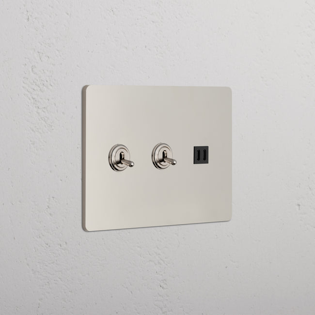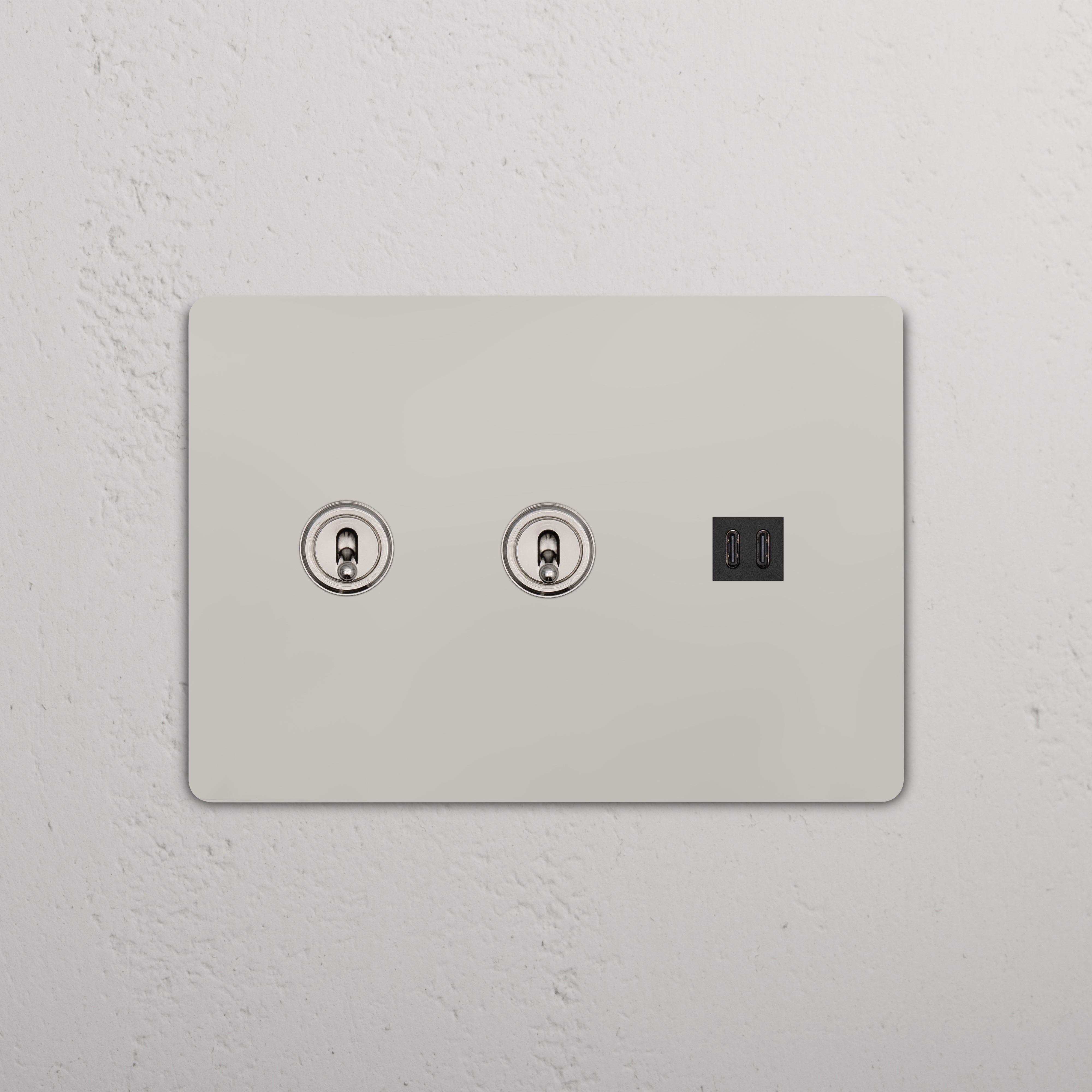 This 3 gang mixed switch and outlet combines two three-way toggle switches and a fast charge USB-C outlet on one plate.