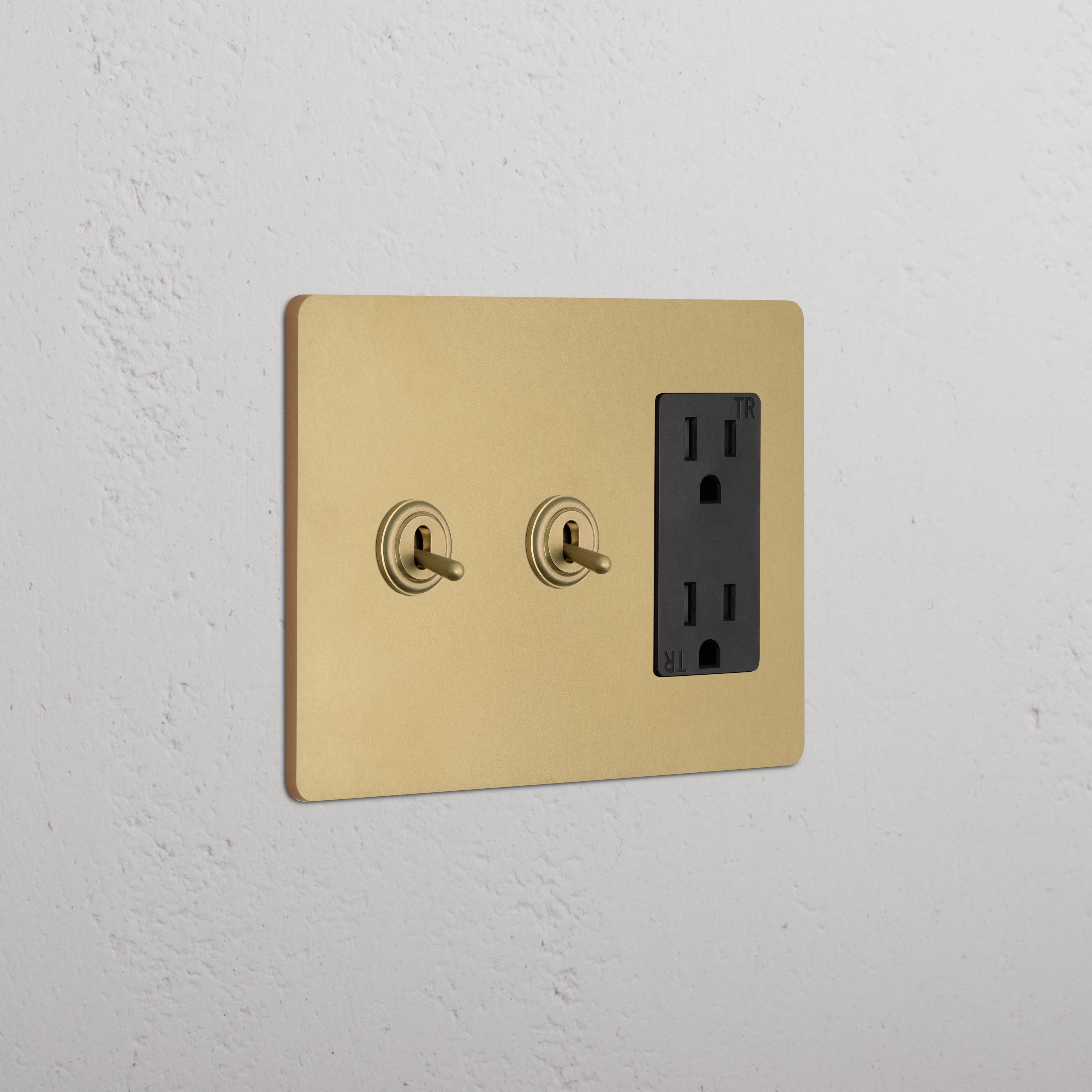 This 3 gang mixed switch and outlet combines two three-way toggle switches and a 15A power outlet on one plate.