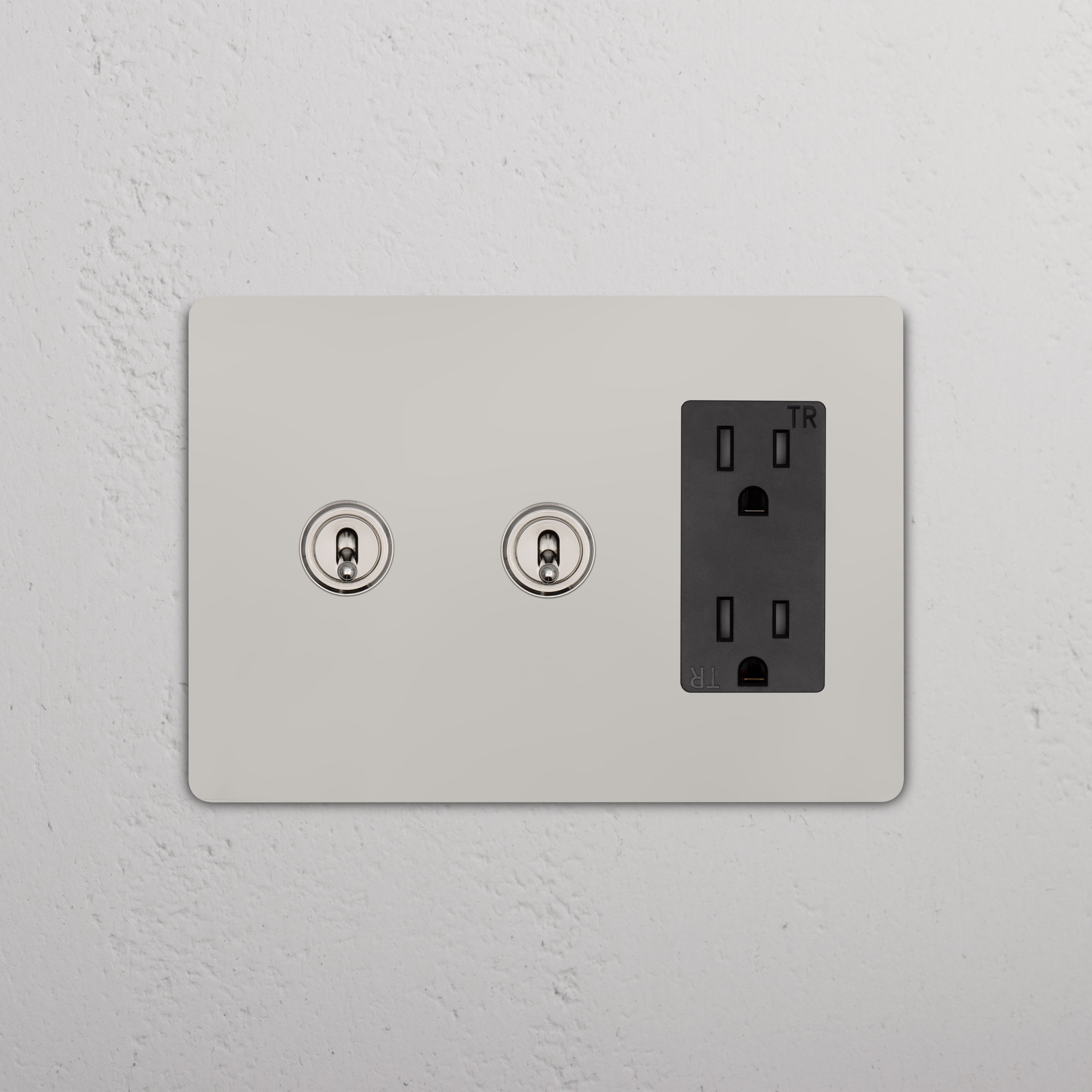 This 3 gang mixed switch and outlet combines two three-way toggle switches and a 15A power outlet on one plate.