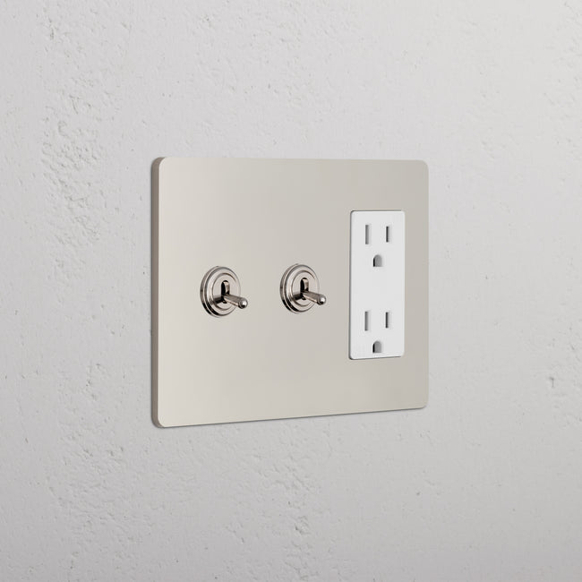 This 3 gang mixed switch and outlet combines two three-way toggle switches and a 15A power outlet on one plate.