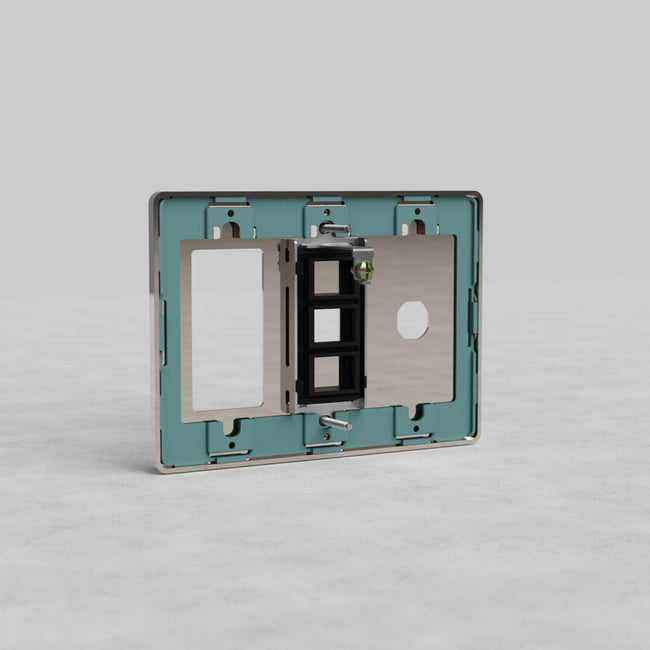This Grove 3 gang outlet, keystone, and switch plate works with any one of our polished nickel toggle or rotary dimmer switches, any one of our rocker switches or outlet modules, and any one of our keystone modules.
