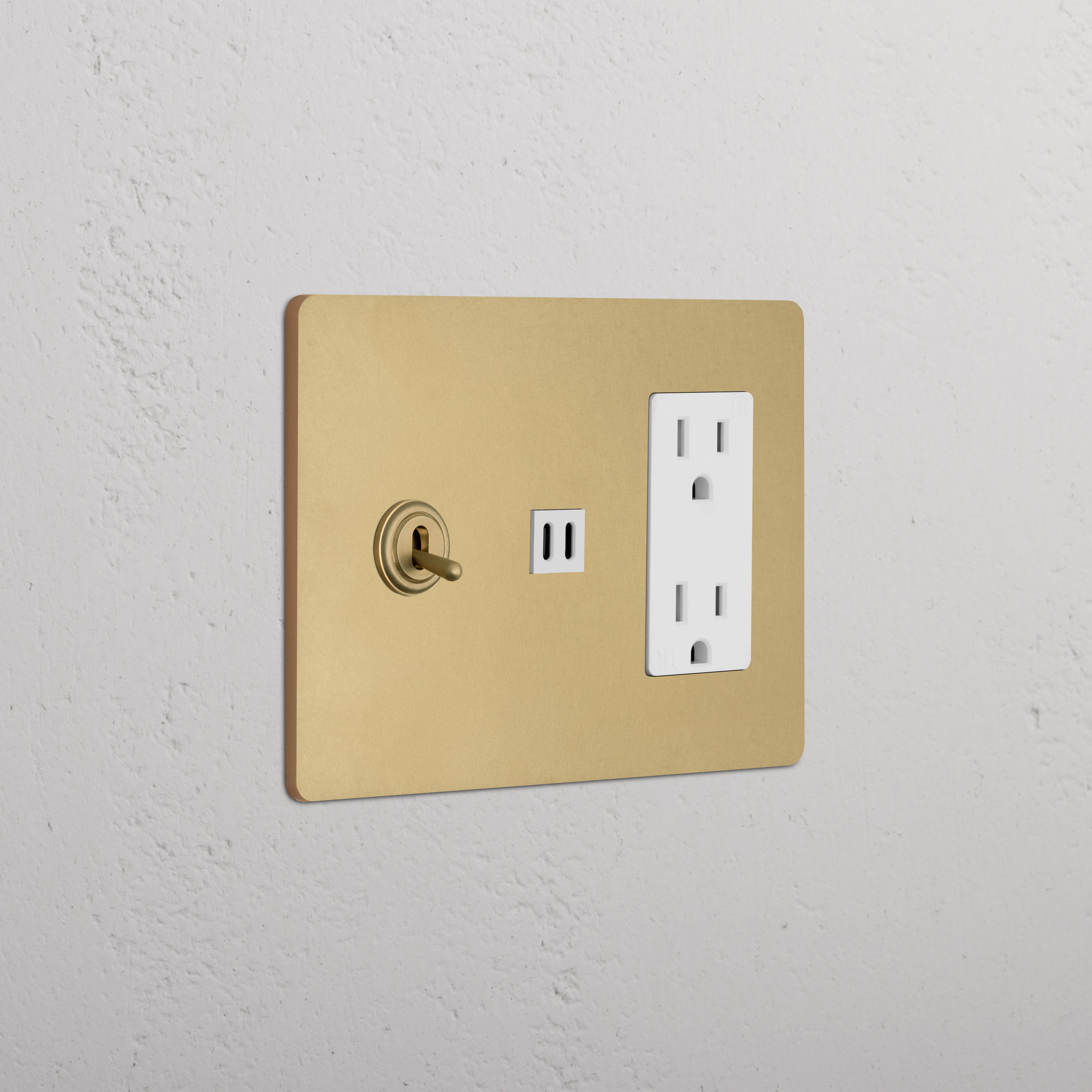 This 3 gang mixed switch and outlet combines a three-way toggle switch, a 15A power outlet, and a fast charge USB-C outlet on one plate.