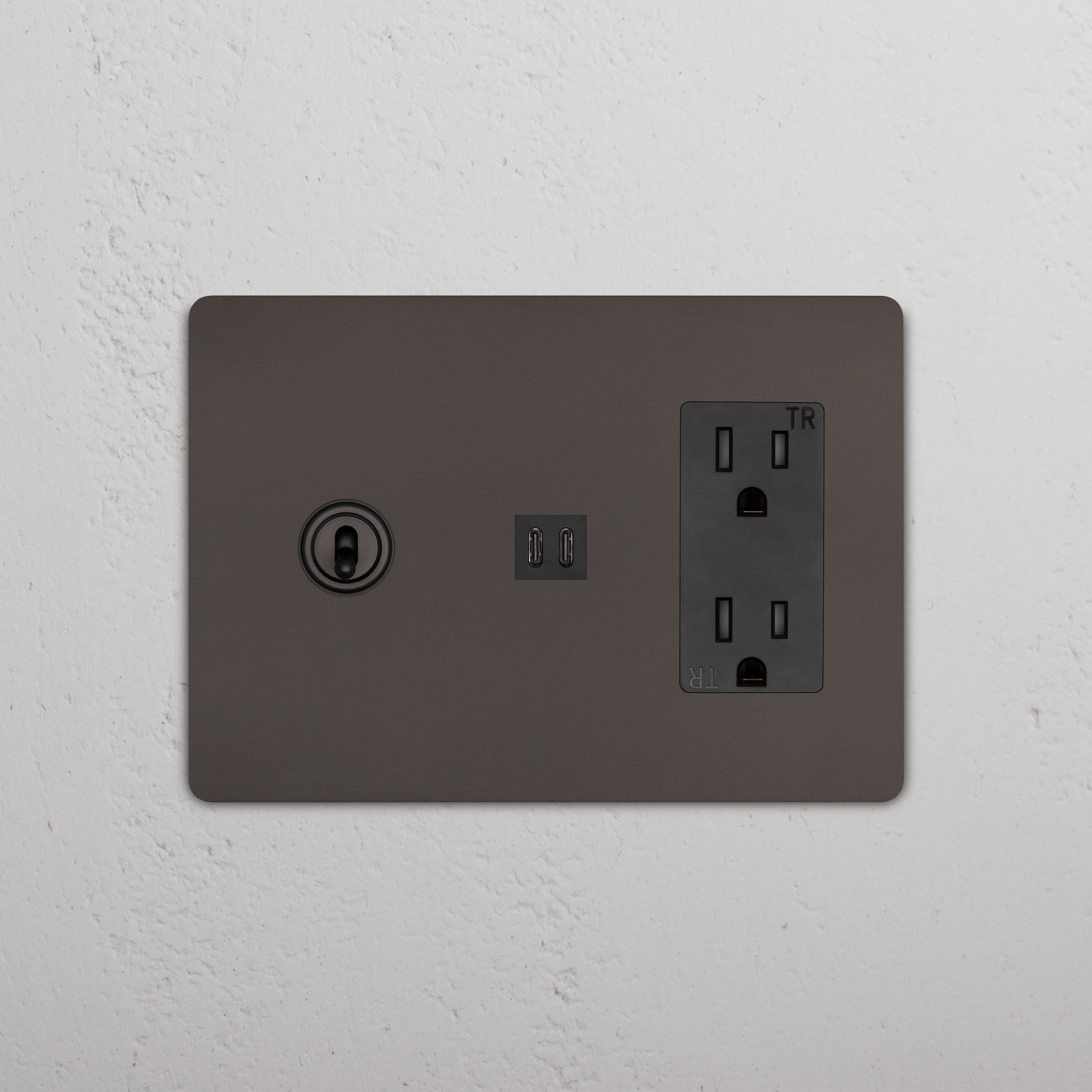 This 3 gang mixed switch and outlet combines a three-way toggle switch, a 15A power outlet, and a fast charge USB-C outlet on one plate.