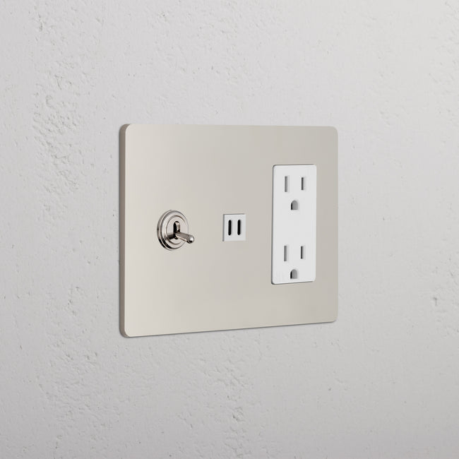 This 3 gang mixed switch and outlet combines a three-way toggle switch, a 15A power outlet, and a fast charge USB-C outlet on one plate.
