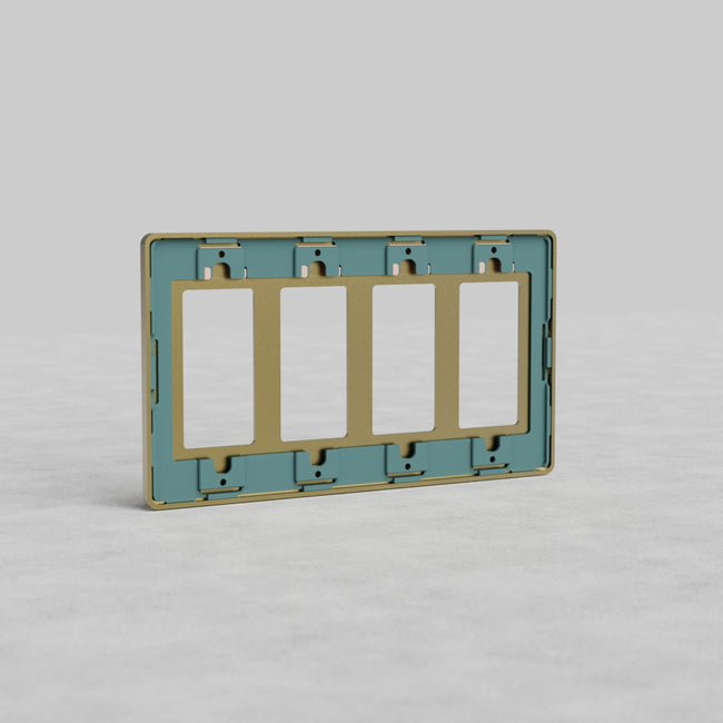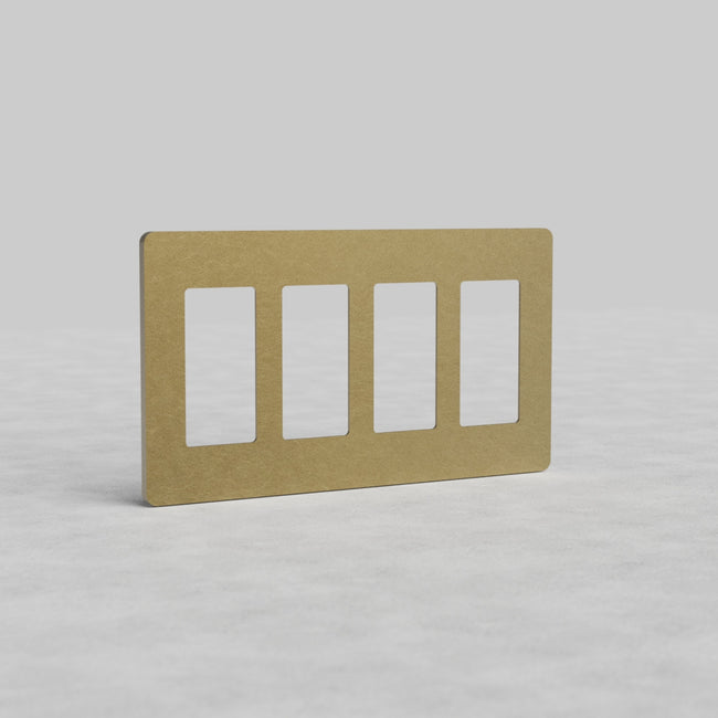 This Grove 4 gang outlet plate works with any four of our antique brass rocker switches or our outlet modules.