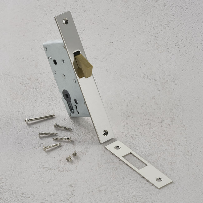 - Polished nickel-finished face plate and strike plate made from solid brass