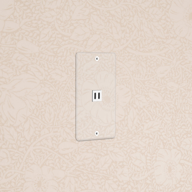 The clear switches and outlets in our Kew collection come with backing paper that you can either paint or use as a wallpaper template. The transparent front plate is then secured over the backing paper to conceal the electrics. All our electrical products should be installed by a qualified electrician.