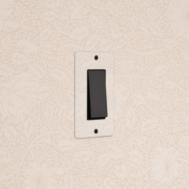 The clear switches and outlets in our Kew collection come with backing paper that you can either paint or use as a wallpaper template. The transparent front plate is then secured over the backing paper to conceal the electrics. All our electrical products should be installed by a qualified electrician.