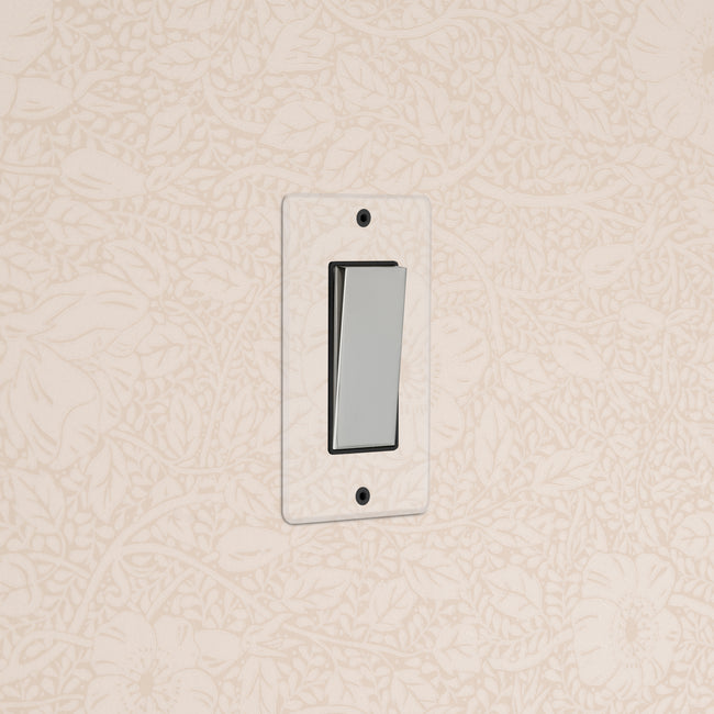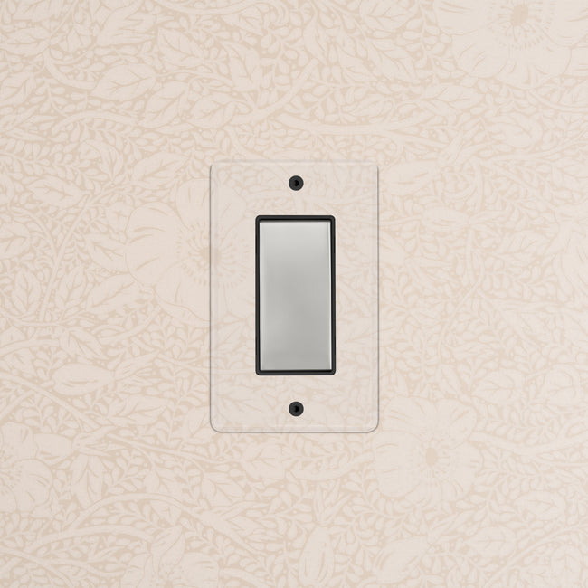 The clear switches and outlets in our Kew collection come with backing paper that you can either paint or use as a wallpaper template. The transparent front plate is then secured over the backing paper to conceal the electrics. All our electrical products should be installed by a qualified electrician.