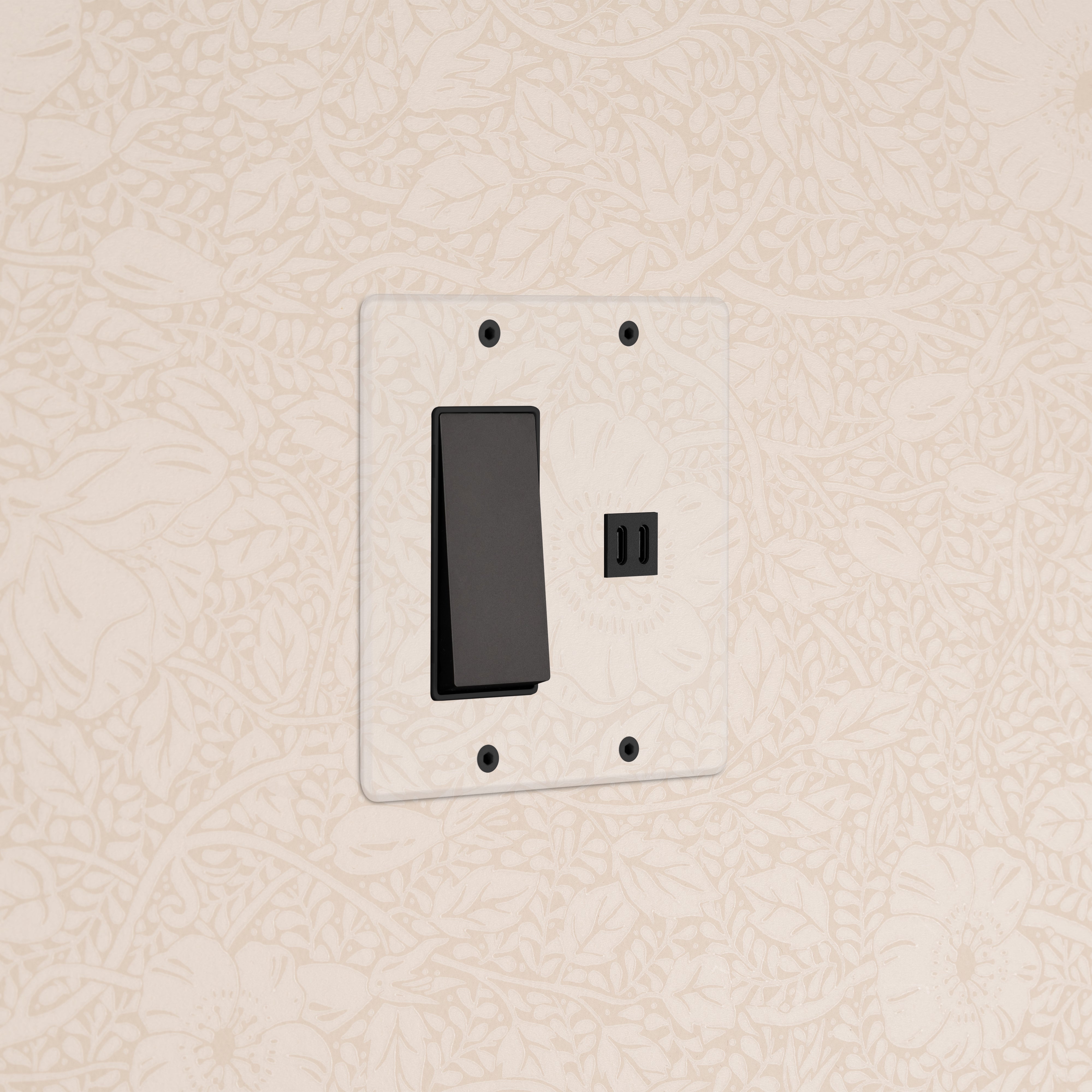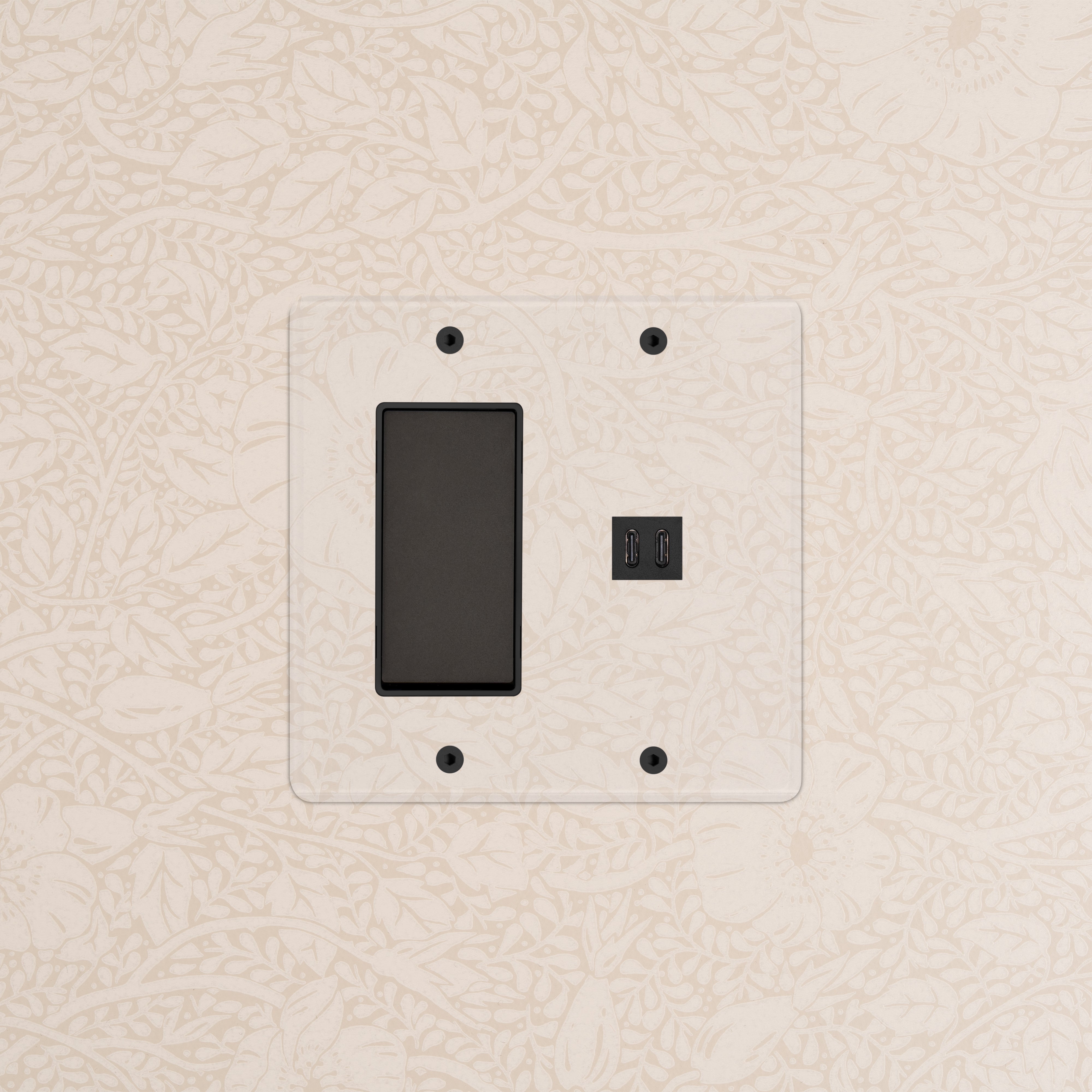 This 2 gang mixed switch and outlet combines a three-way rocker switch and a fast charge USB-C outlet on one plate.