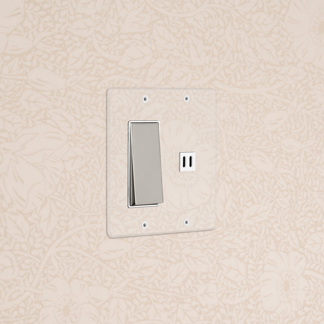 The clear switches and outlets in our Kew collection come with backing paper that you can either paint or use as a wallpaper template. The transparent front plate is then secured over the backing paper to conceal the electrics. All our electrical products should be installed by a qualified electrician.