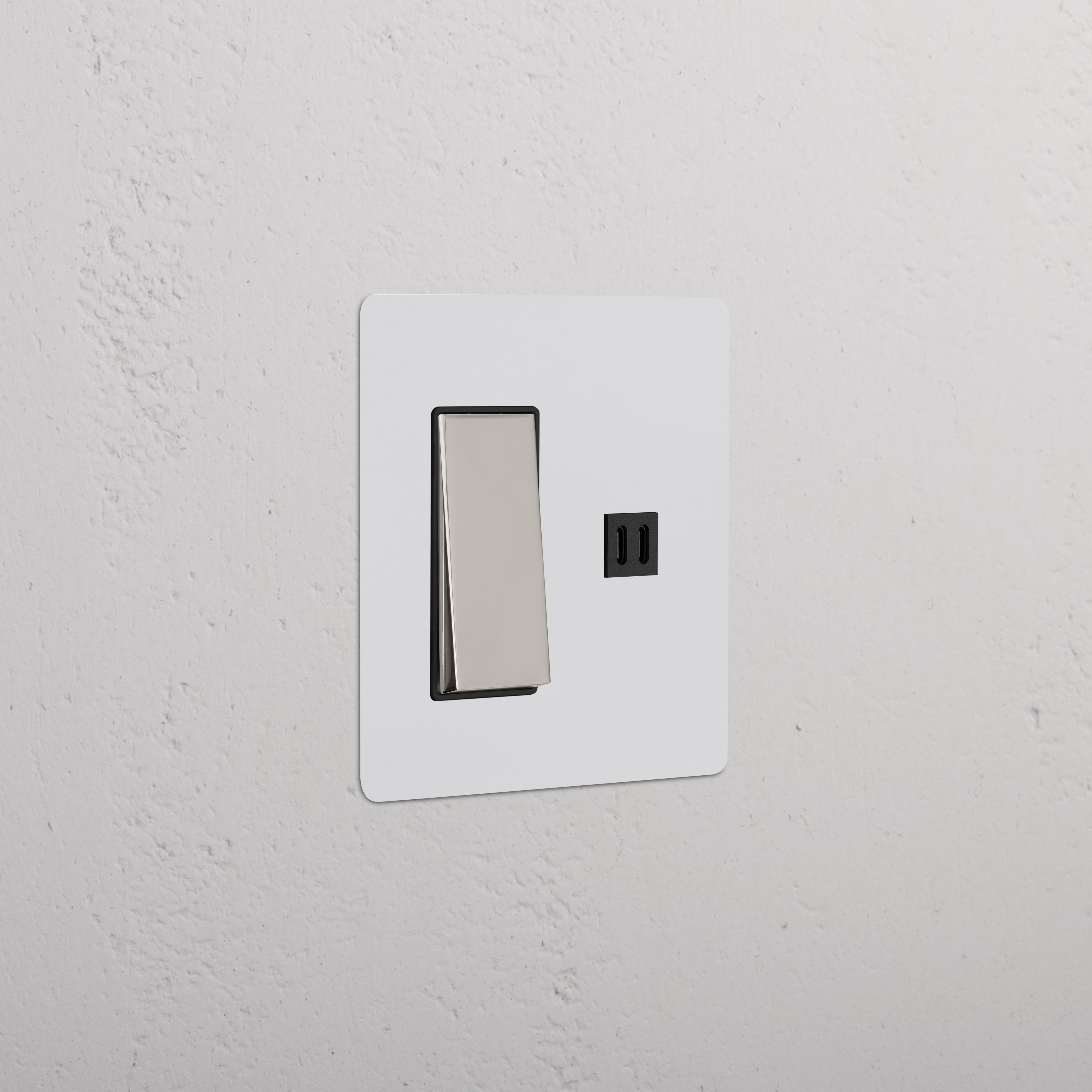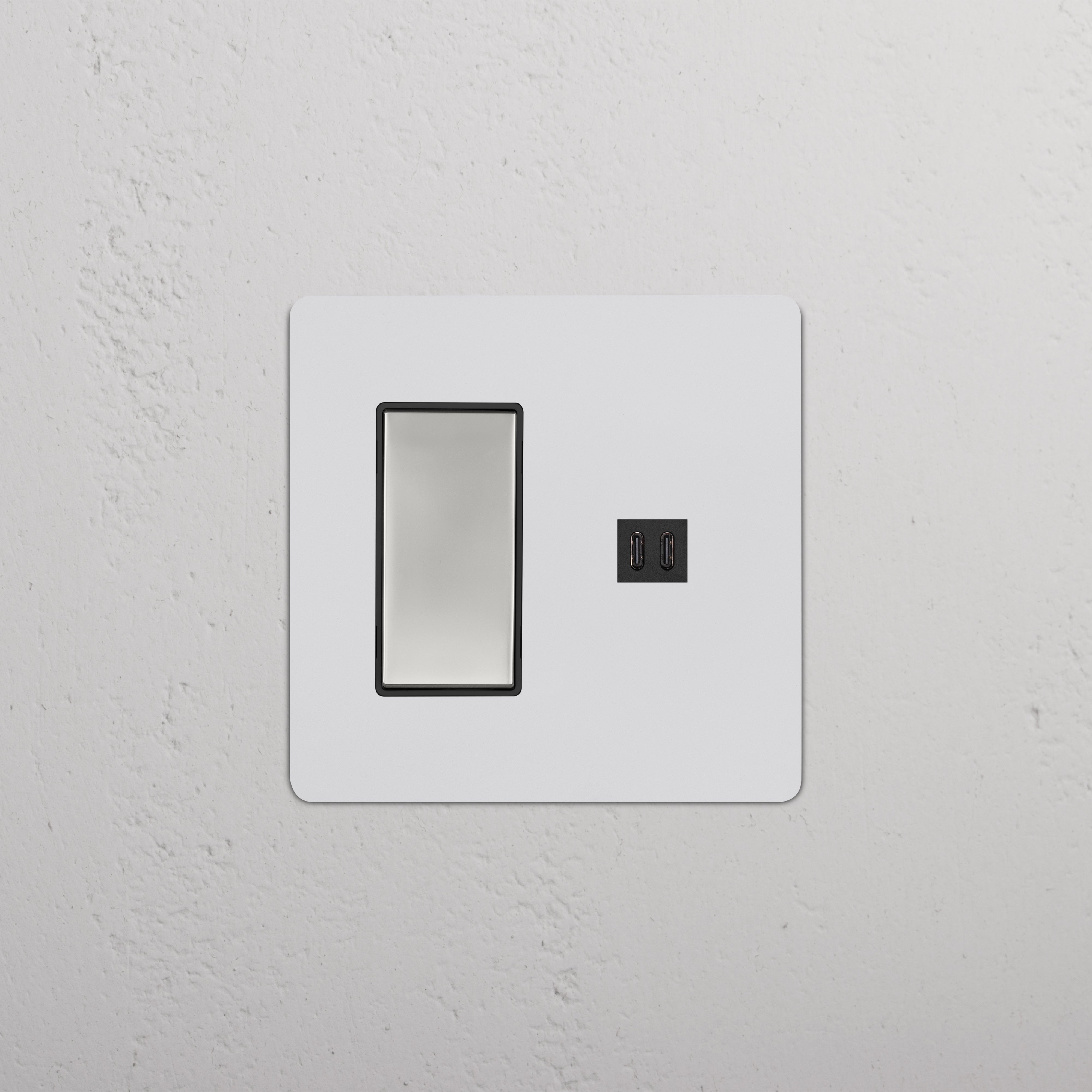 This 2 gang mixed switch and outlet combines a three-way rocker switch and a fast charge USB-C outlet on one plate.