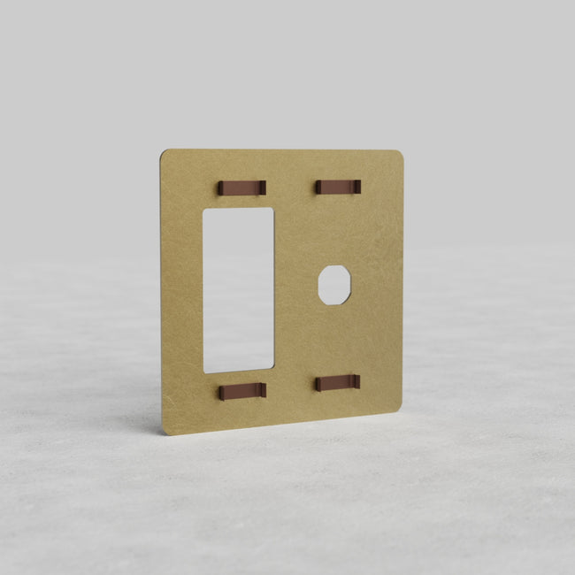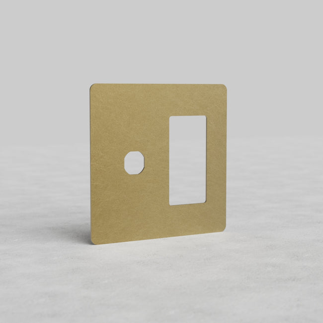 This Kew 2 gang switch and outlet plate works with any one of our antique brass toggle or rotary dimmer switches and any one of our rocker switches or outlet modules.