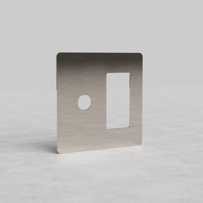 This Kew 2 gang switch and outlet plate works with any one of our polished nickel toggle or rotary dimmer switches and any one of our rocker switches or our outlet modules.