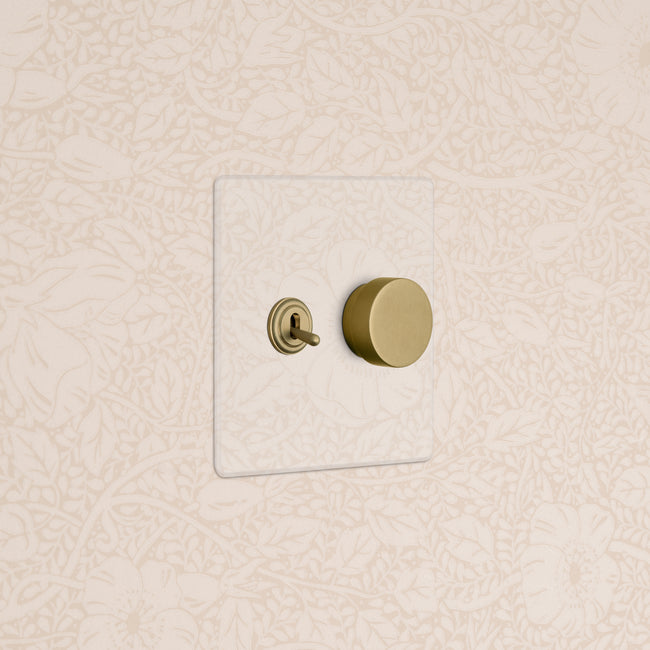 This 2 gang mixed switch combines a three-way toggle and a rotary dimmer on one plate.