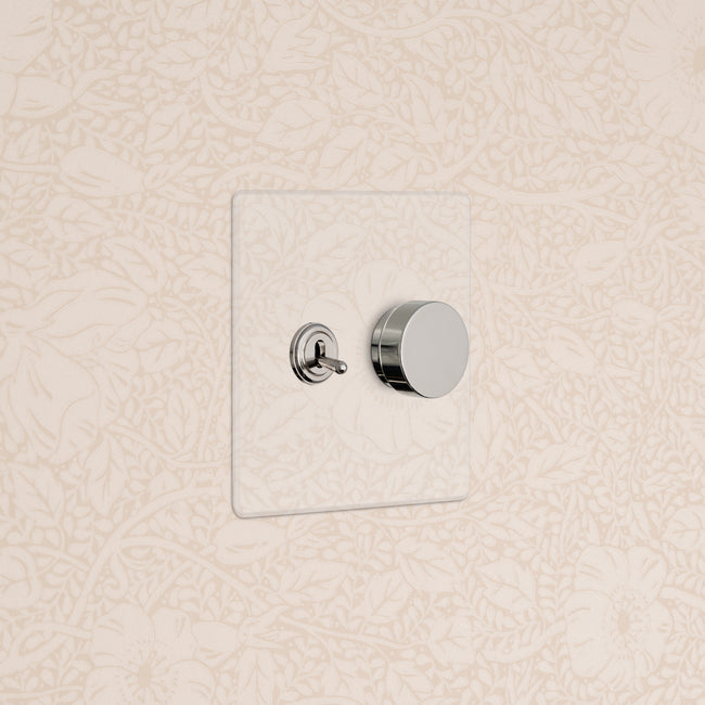 This 2 gang mixed switch combines a three-way toggle and a rotary dimmer on one plate.