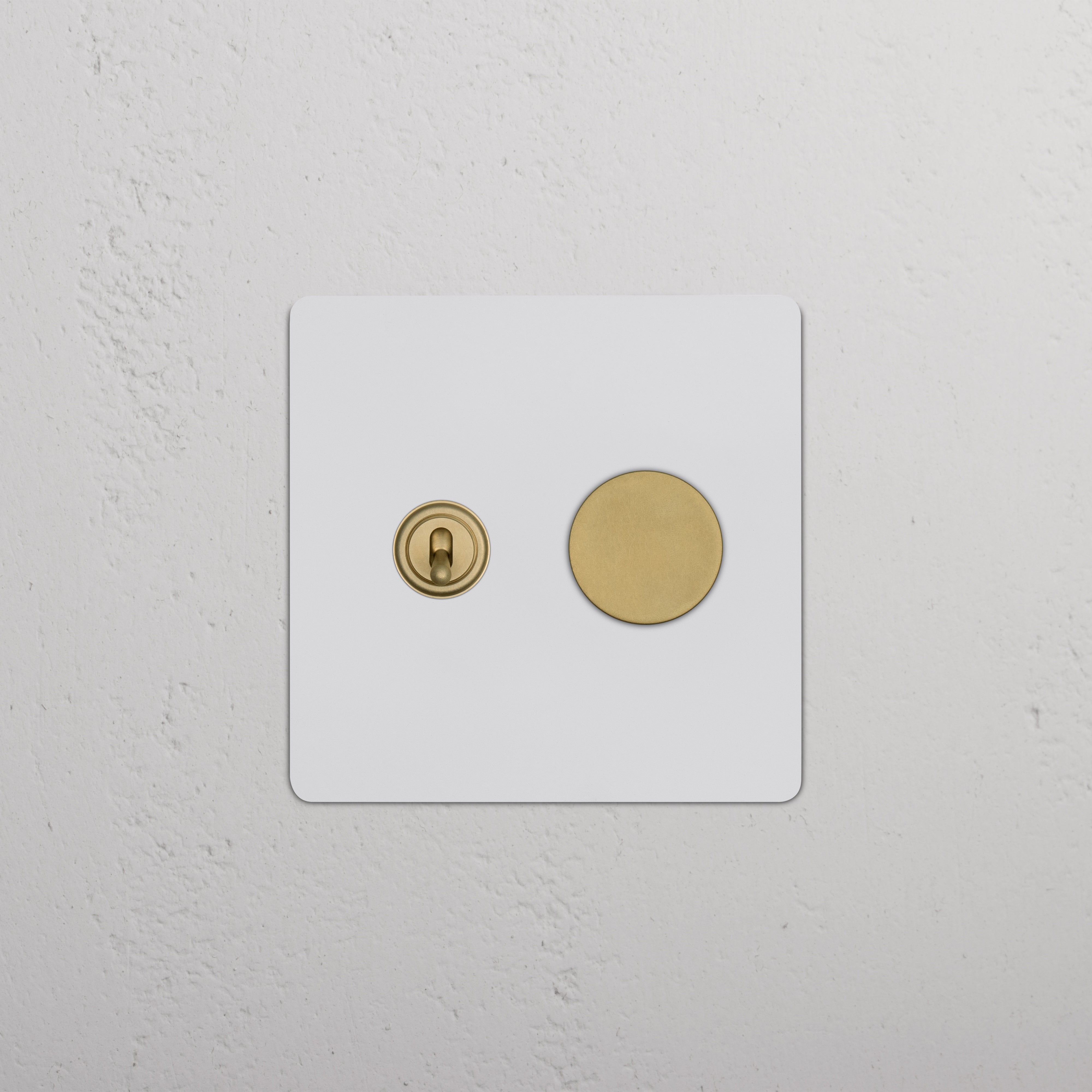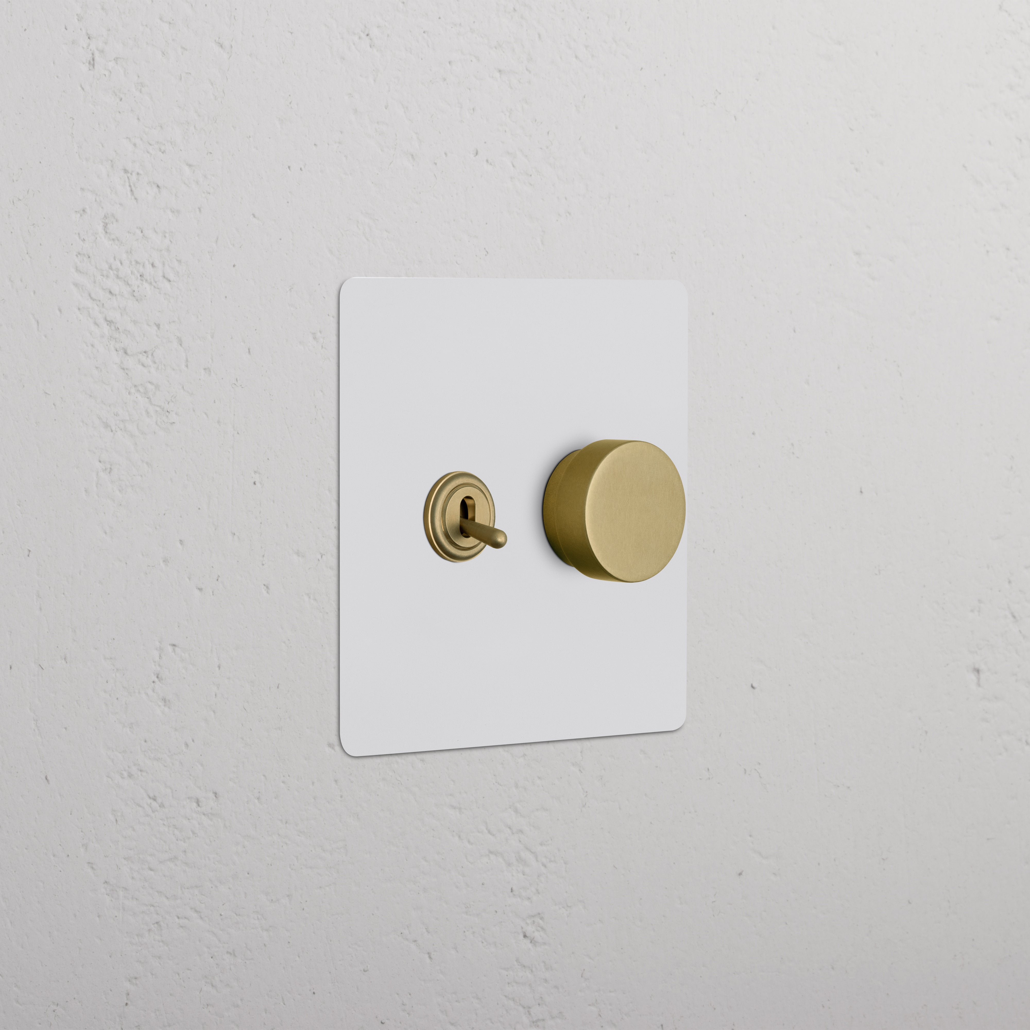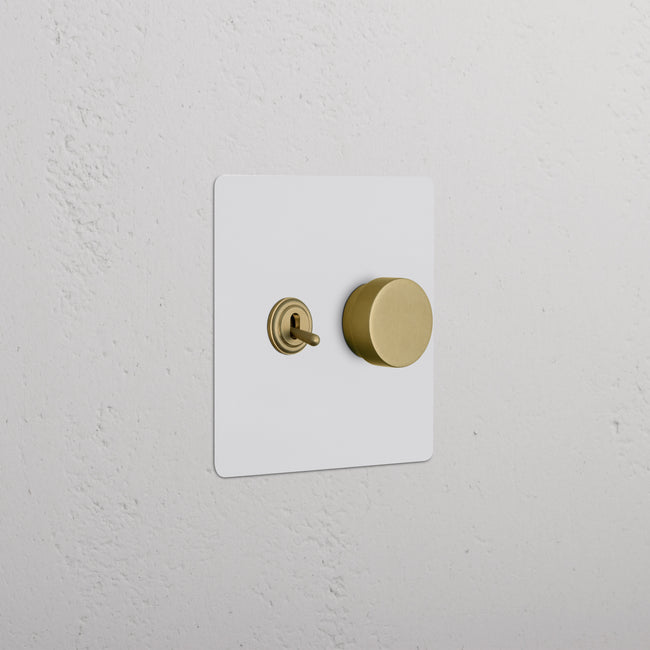 This 2 gang mixed switch combines a three-way toggle and a rotary dimmer on one plate.