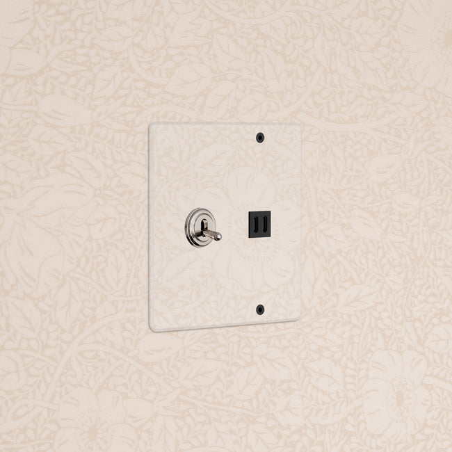 The clear switches and outlets in our Kew collection come with backing paper that you can either paint or use as a wallpaper template. The transparent front plate is then secured over the backing paper to conceal the electrics. All our electrical products should be installed by a qualified electrician.