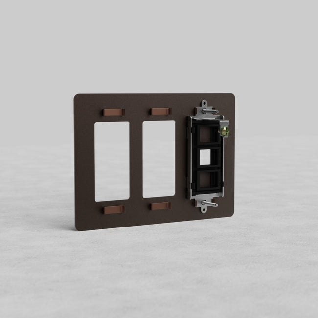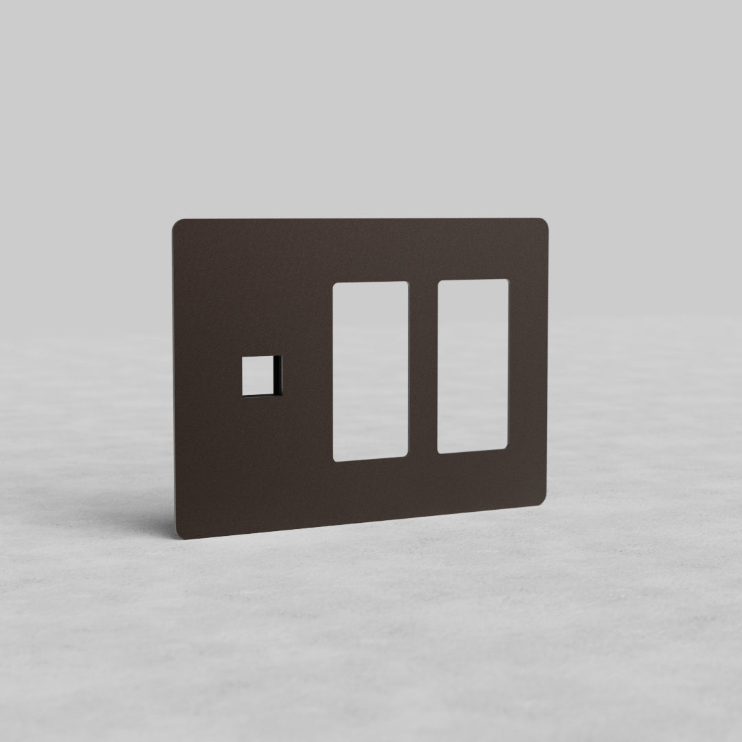 This Kew 3 gang 2x outlet and keystone plate works with any two of our bronze rocker switches or outlet modules and any one of our keystone modules (just make sure you choose the ones made with black plastic).