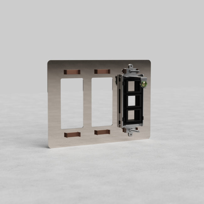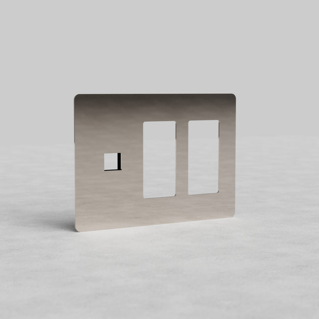 This Kew 3 gang 2x outlet and keystone plate works with any two of our polished nickel rocker switches or outlet modules and any one of our keystone modules.