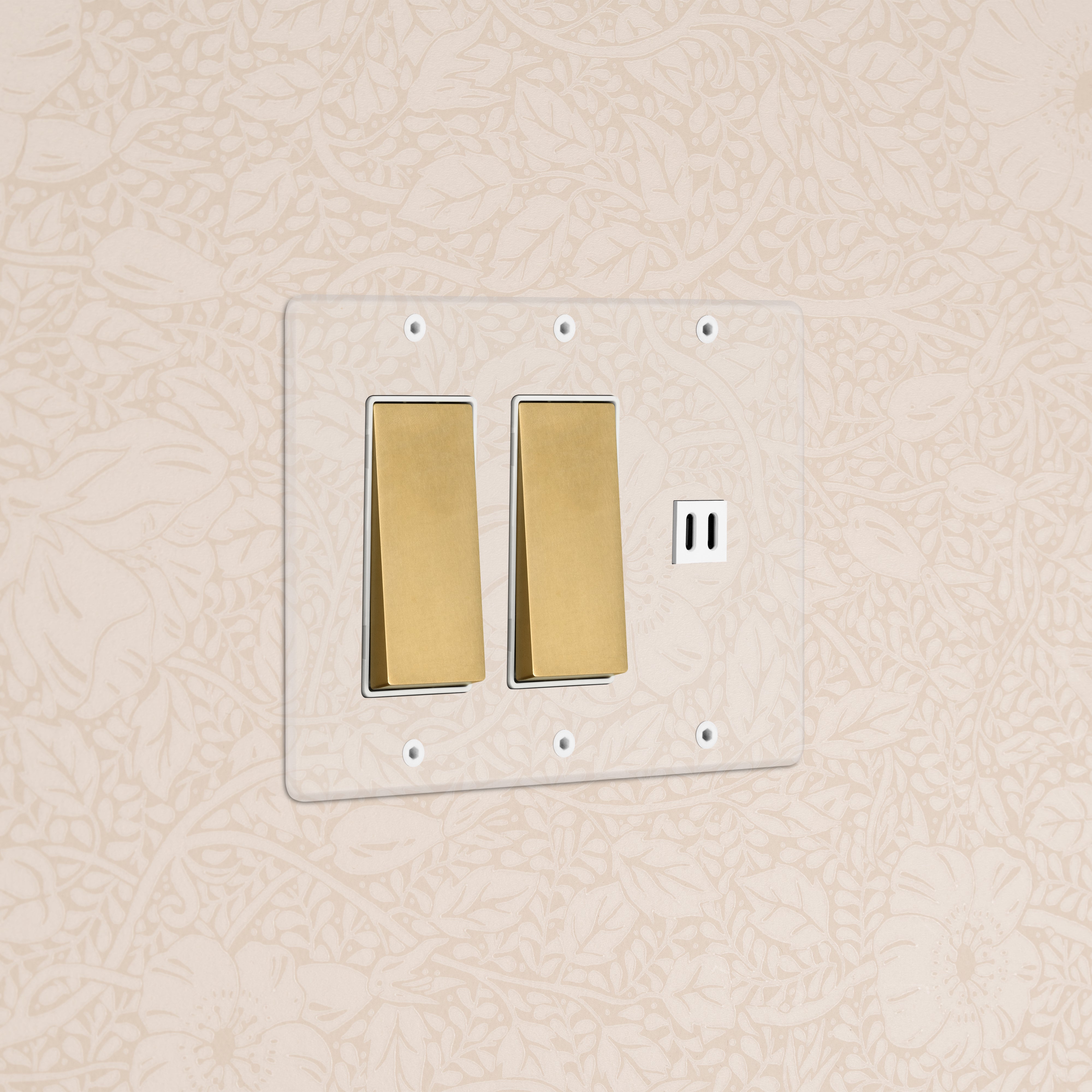 This 3 gang mixed switch and outlet combines two three-way rocker switches and a fast charge USB-C outlet on one plate.