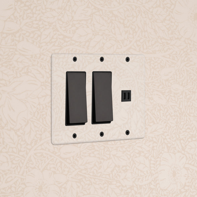 This 3 gang mixed switch and outlet combines two three-way rocker switches and a fast charge USB-C outlet on one plate.