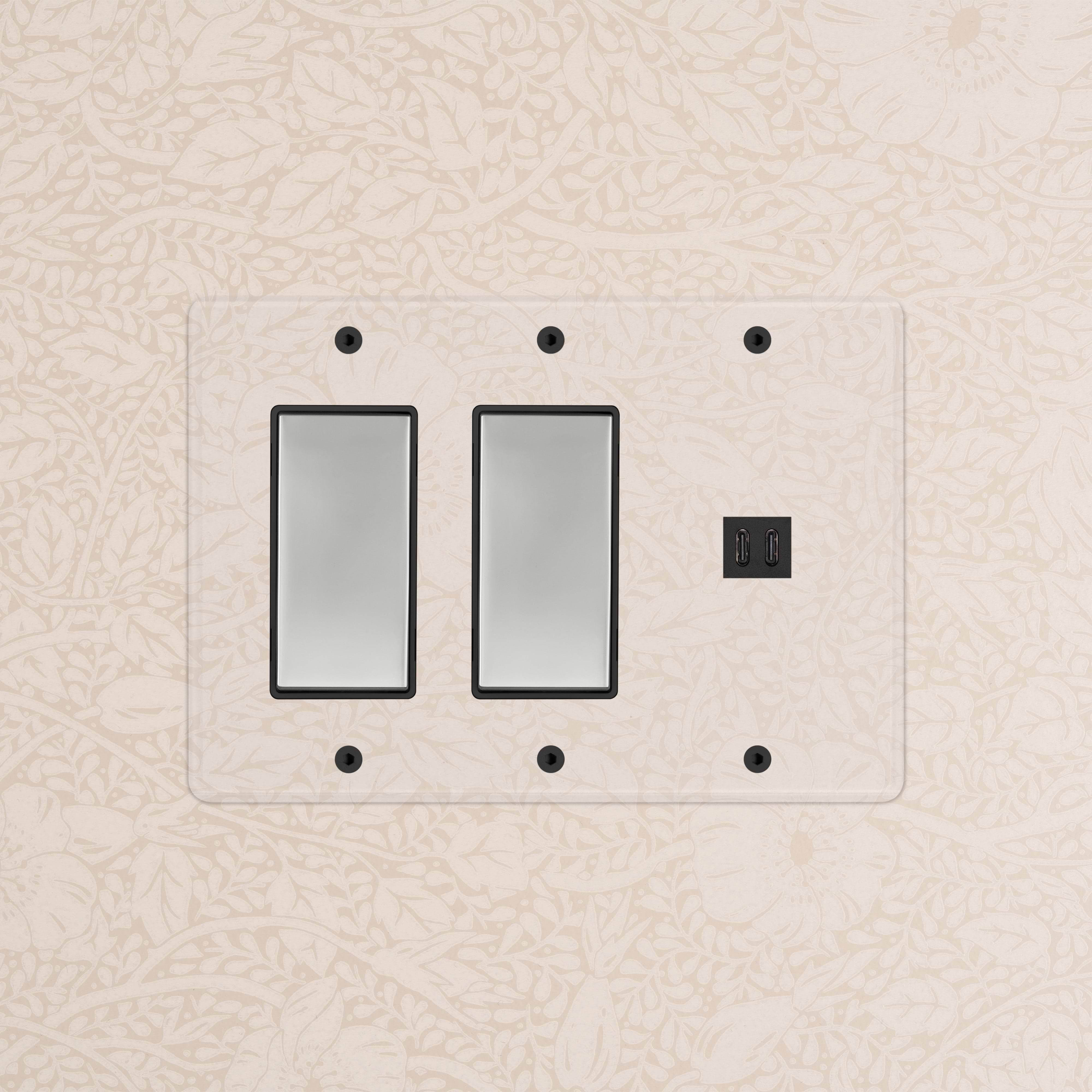 This 3 gang mixed switch and outlet combines two three-way rocker switches and a fast charge USB-C outlet on one plate.