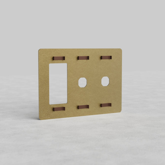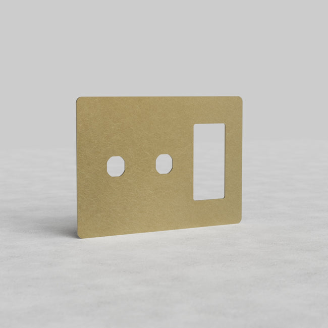 This Kew 3 gang 2x switch and outlet plate works with any two of our antique brass toggle or rotary dimmer switches and any one of our rocker switches or outlet modules.