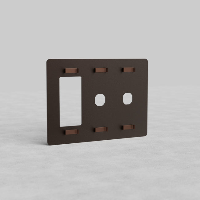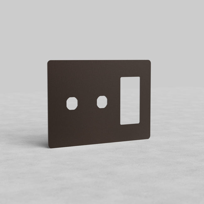 This Kew 3 gang 2x switch and outlet plate works with any two of our bronze toggle or rotary dimmer switches and any one of our bronze rocker switches or outlet modules (just make sure you choose the ones made with black plastic).