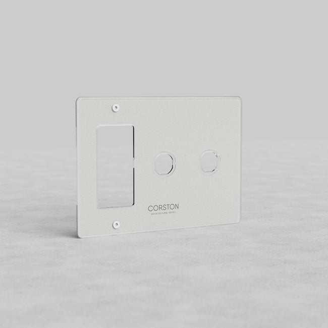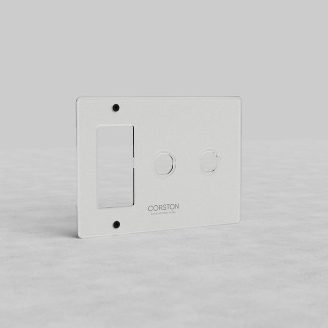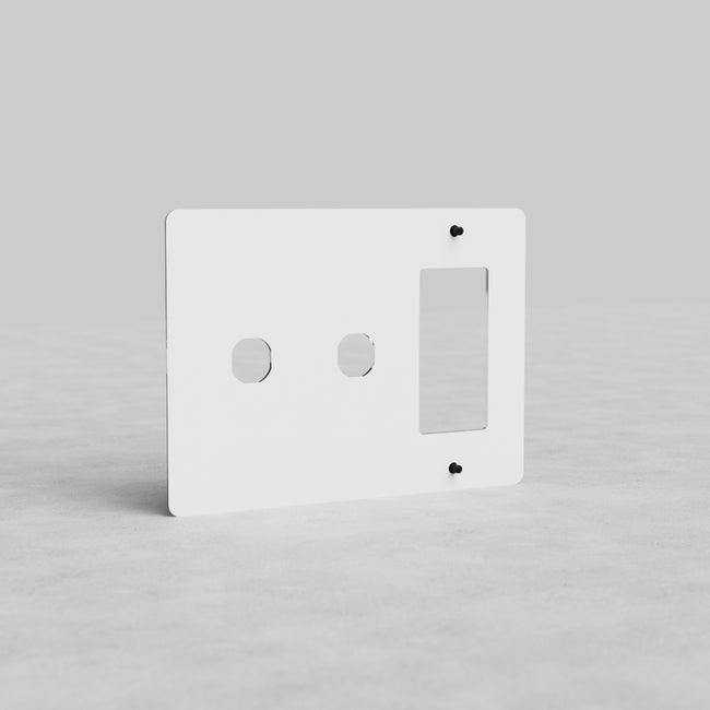 This Kew clear 3 gang 2x switch and outlet plate works with any two of our toggle or rotary dimmer switches and any one of our rocker switches or outlet modules.