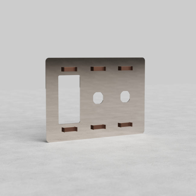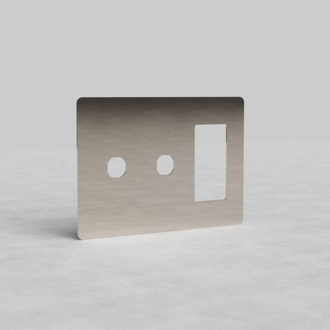 This Kew 3 gang 2x switch and outlet plate works with any two of our polished nickel toggle or rotary dimmer switches and any one of our rocker switches or outlet modules.