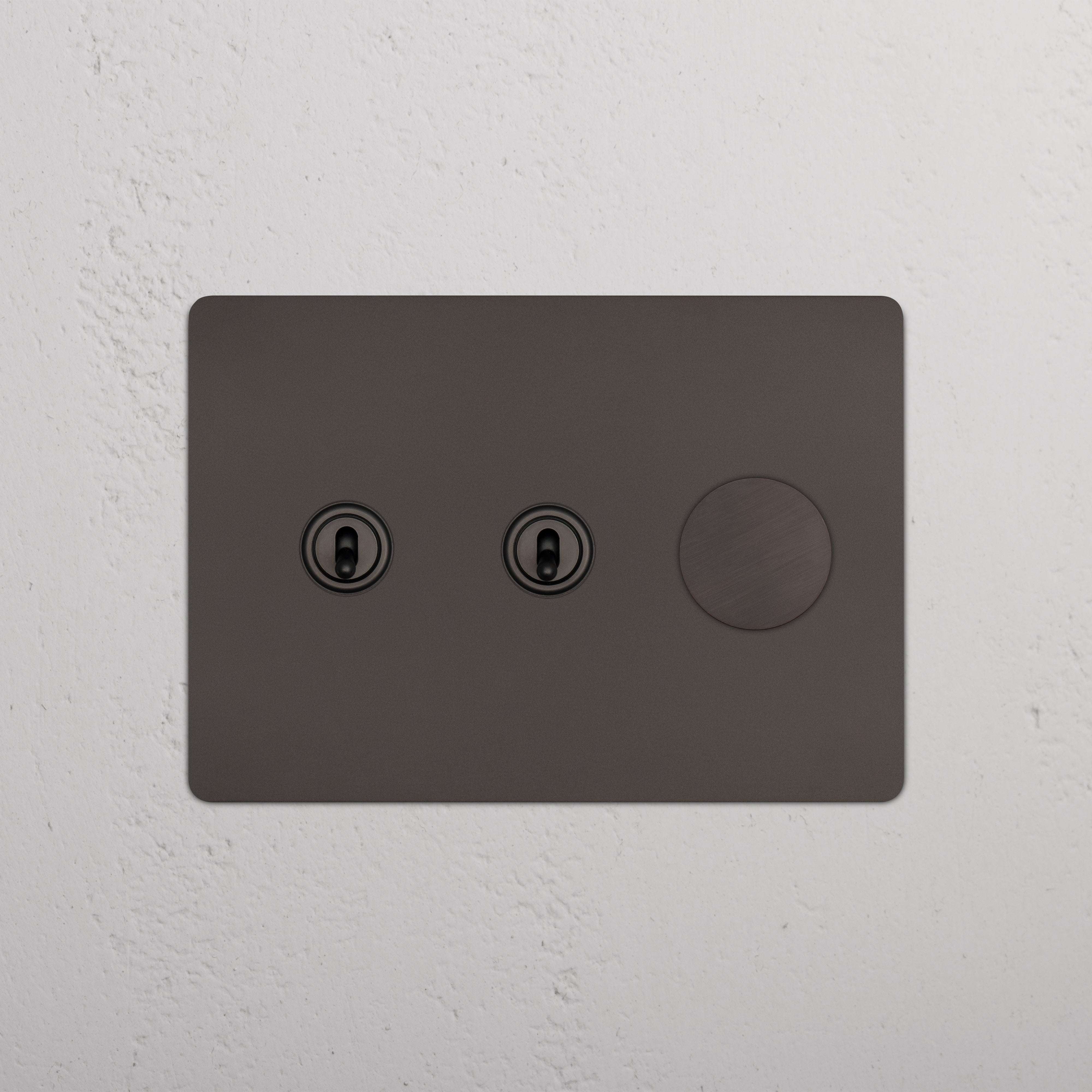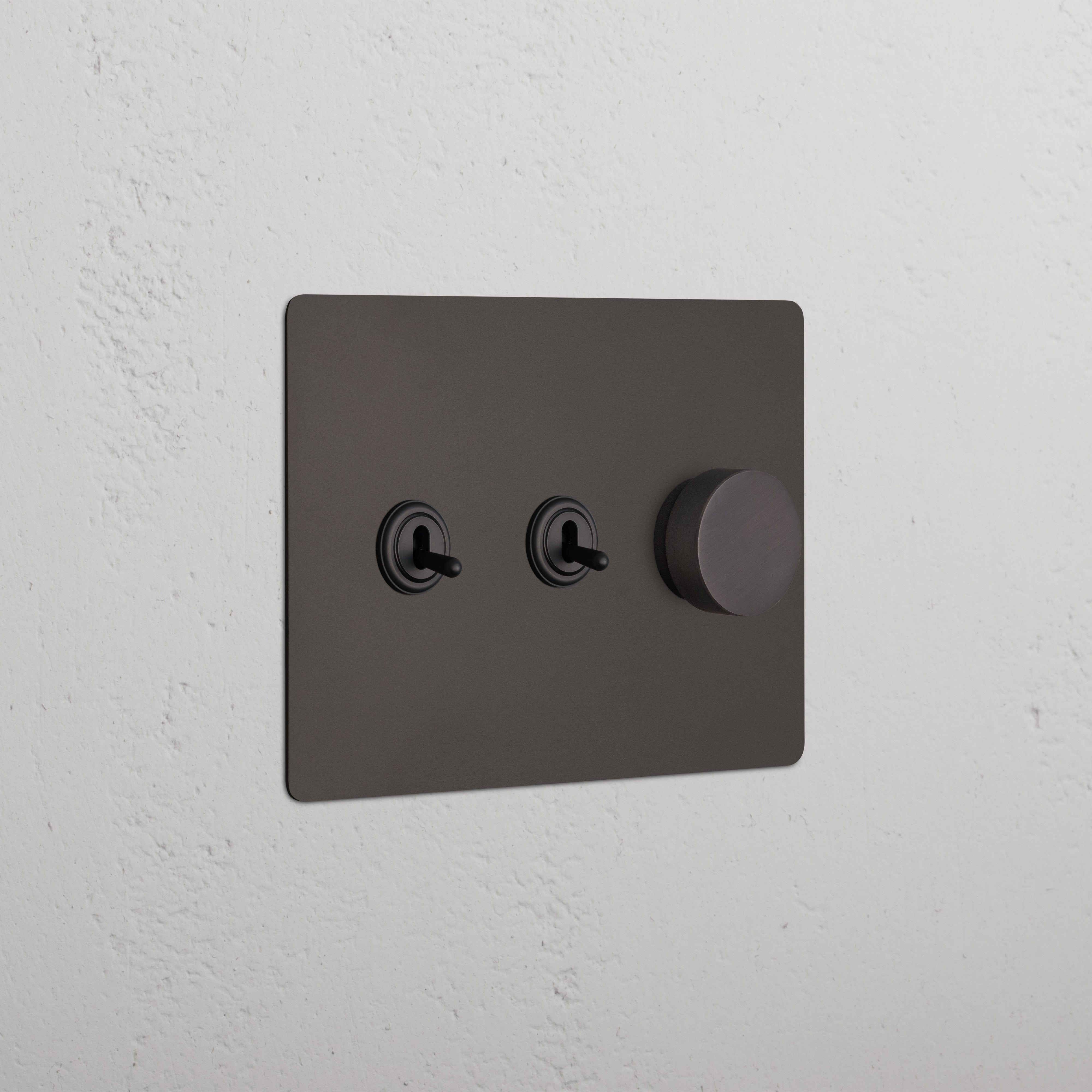 This 3 gang mixed switch combines two three-way toggles and a rotary dimmer on one plate.