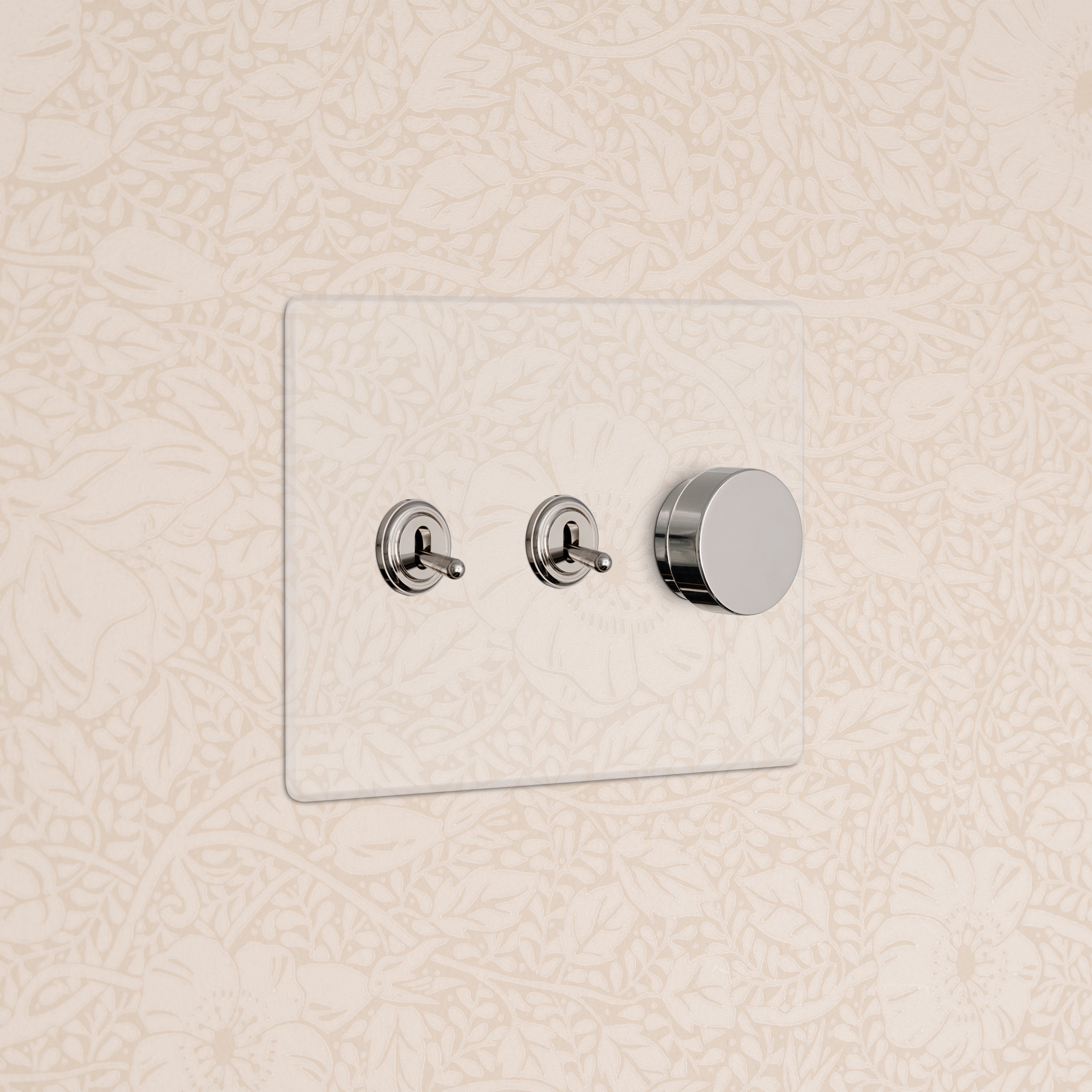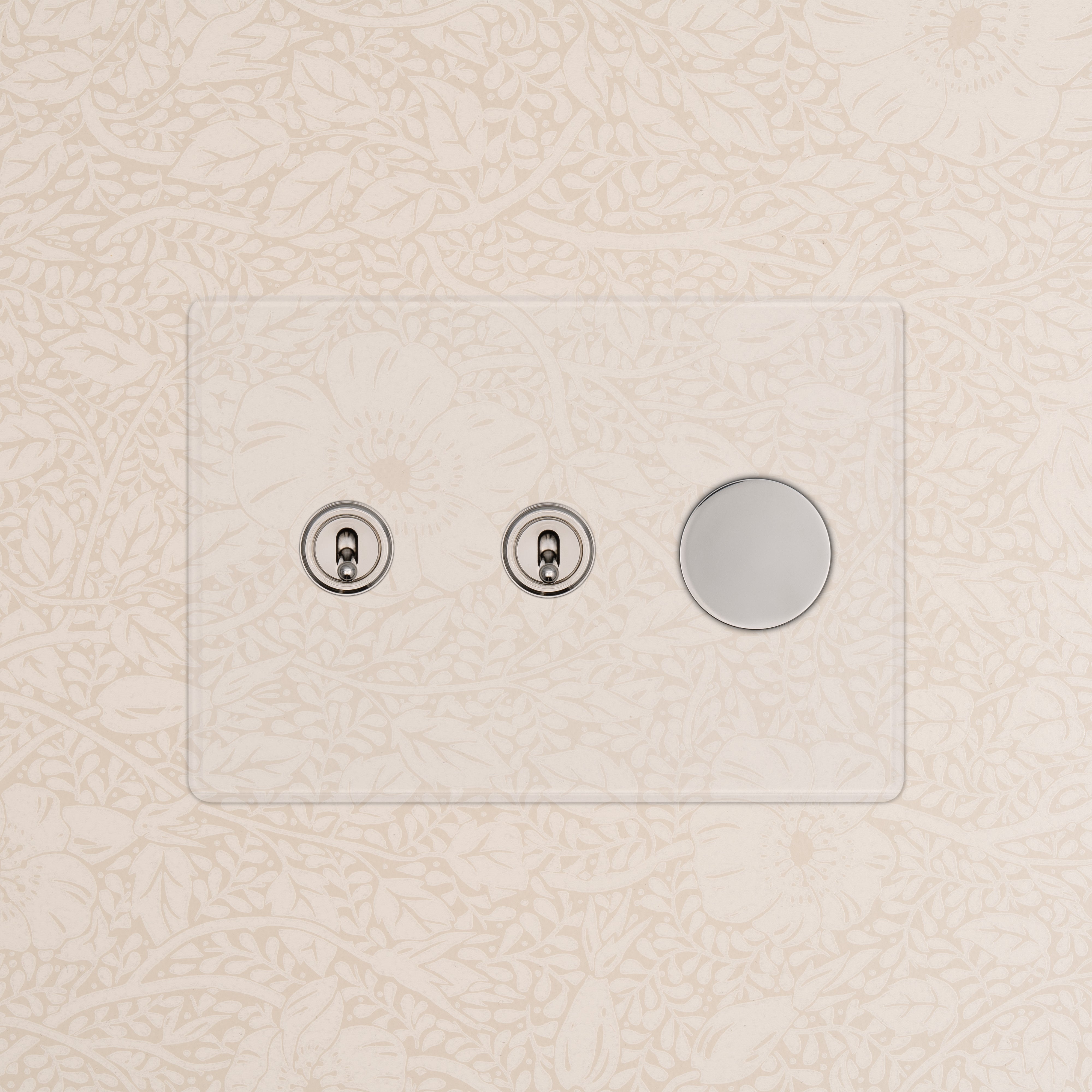This 3 gang mixed switch combines two three-way toggles and a rotary dimmer on one plate.