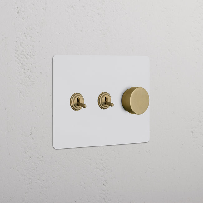 This 3 gang mixed switch combines two three-way toggles and a rotary dimmer on one plate.