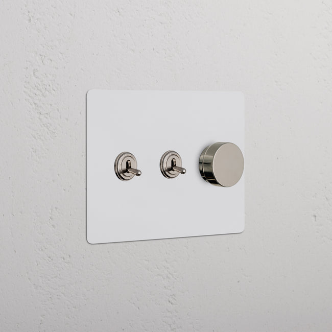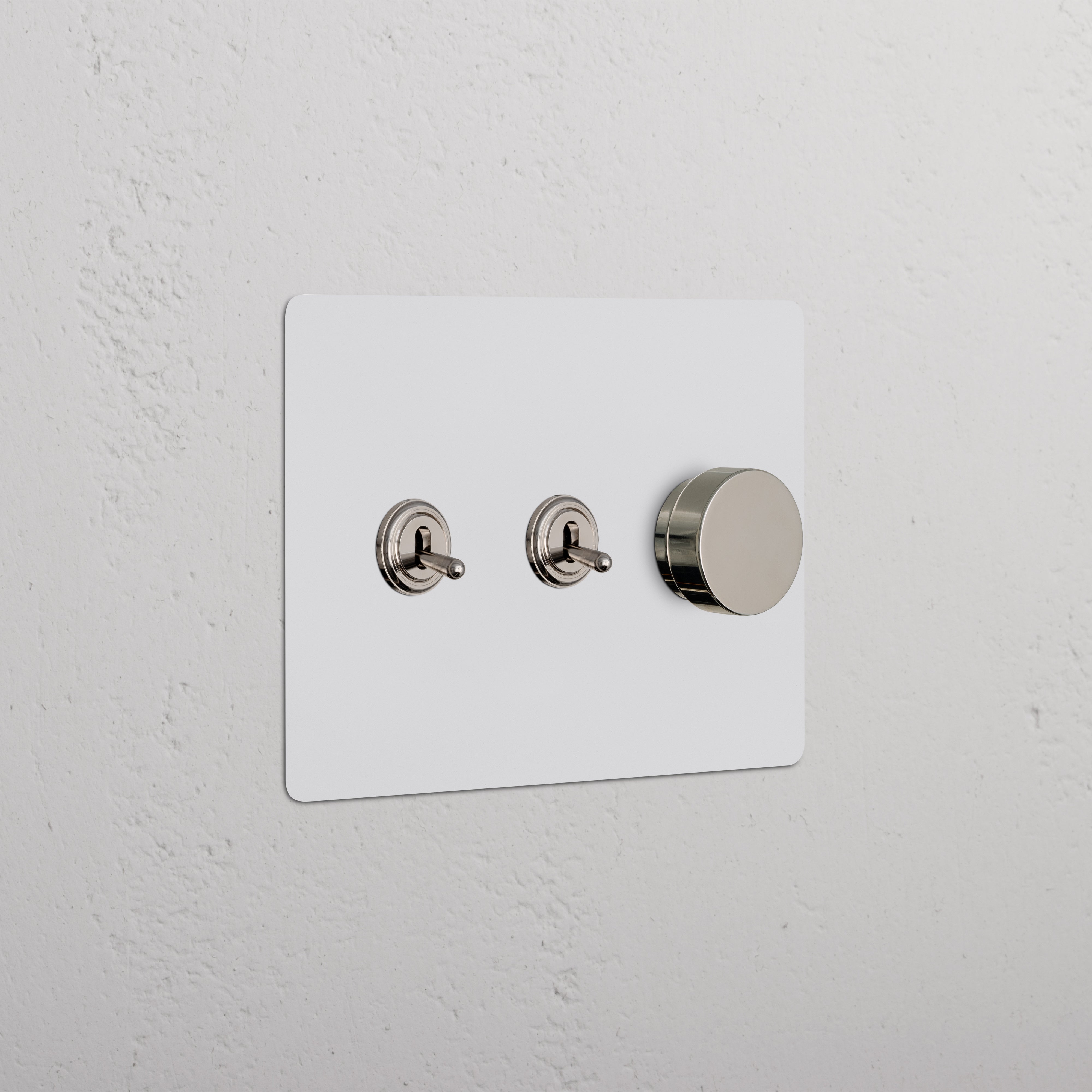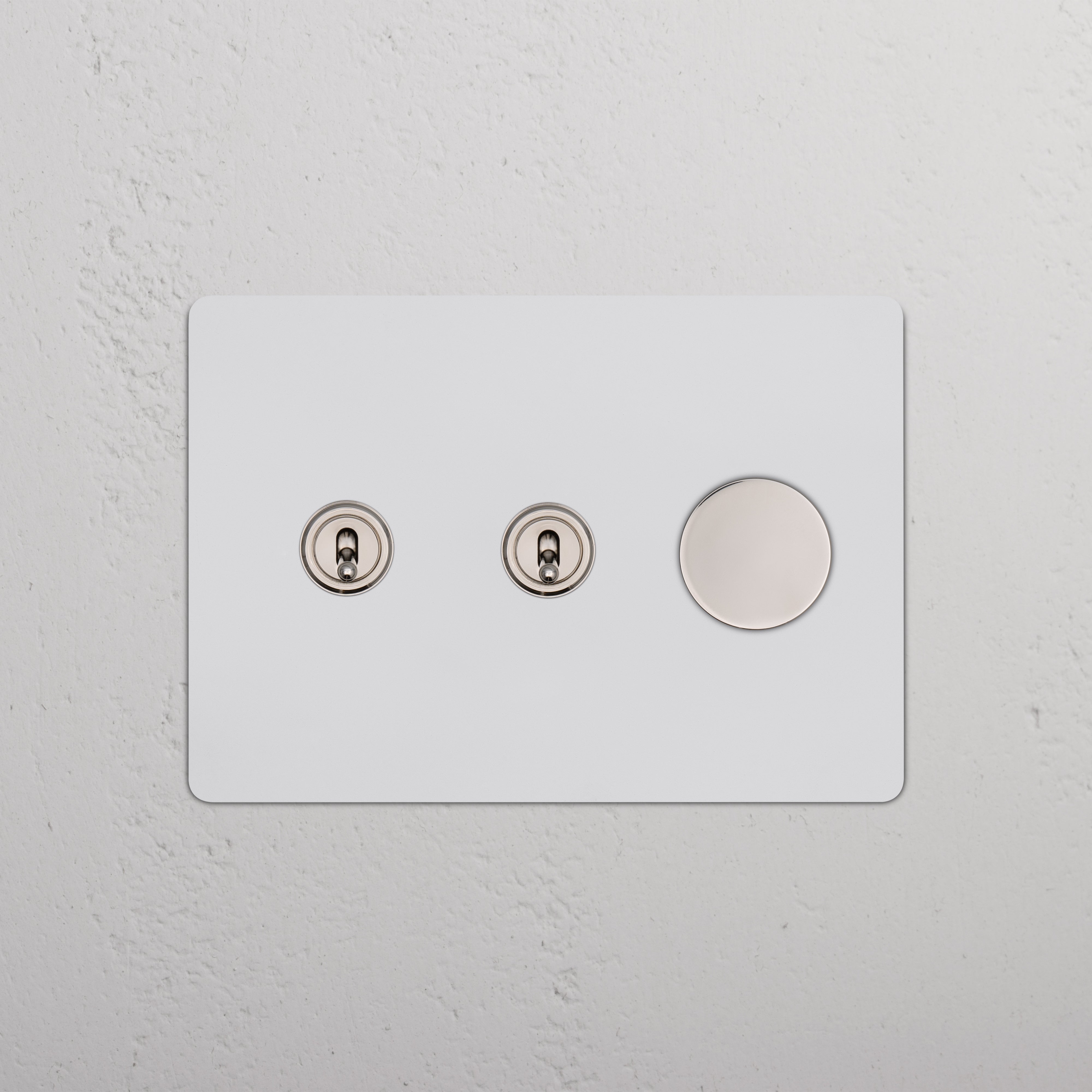This 3 gang mixed switch combines two three-way toggles and a rotary dimmer on one plate.