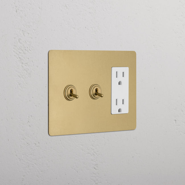 This 3 gang mixed switch and outlet combines two three-way toggle switches and a 15A power outlet on one plate.