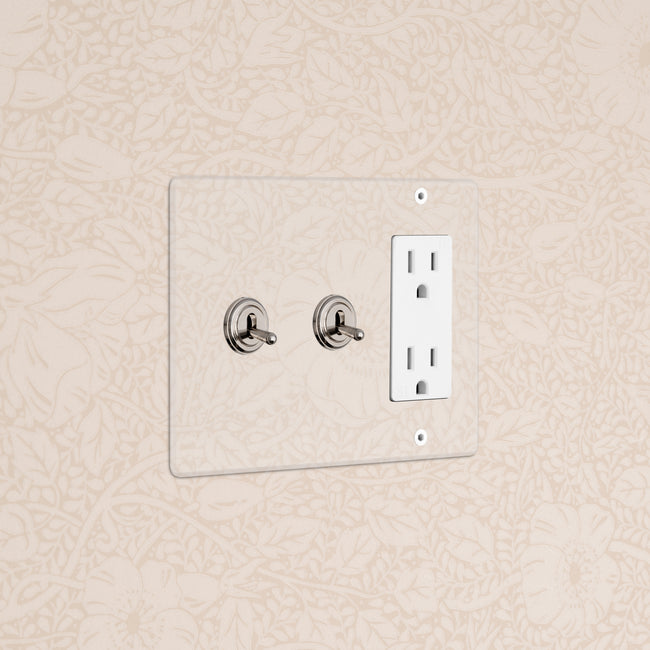 This 3 gang mixed switch and outlet combines two three-way toggle switches and a 15A power outlet on one plate.